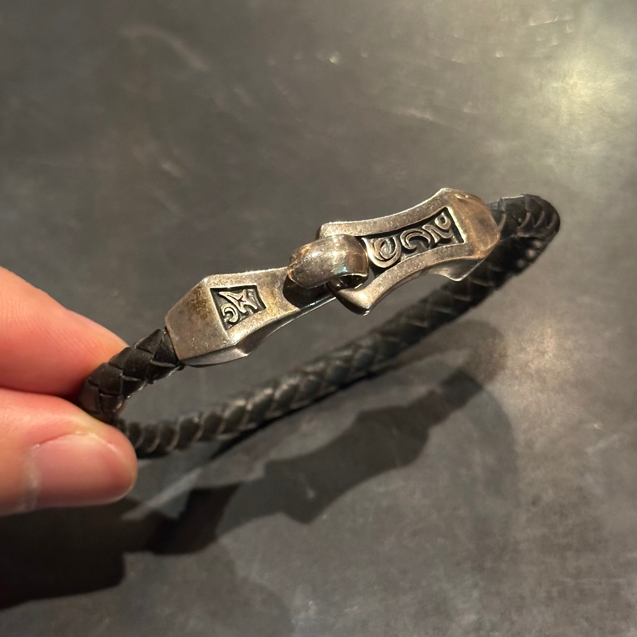 海外で買い付けたフックデザインのシルバーレザーブレスレットです。