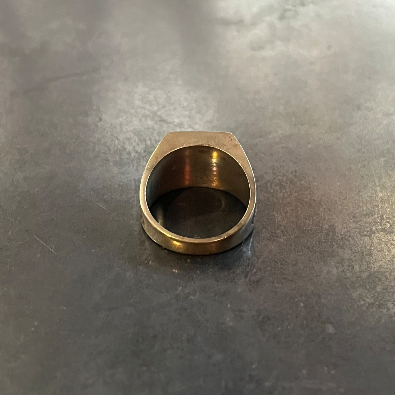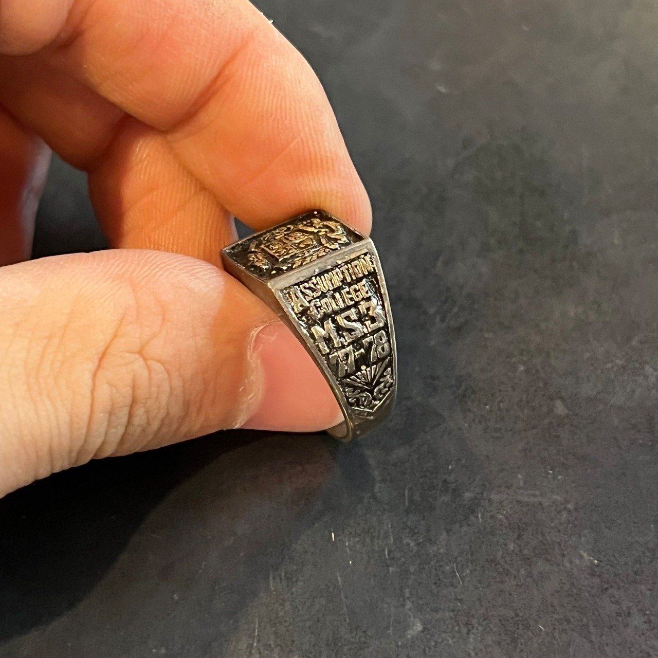 文字とエンブレムが中央に刻まれた重厚なシグネットスタイルで、リングのフェイス部分には大学の校章と思われる紋章が立体的に彫り込まれ、サイドには「ASSUMPTION COLLEGE」「N.S.F(National Science Foundation)」、そして「1978」と彫刻されております。