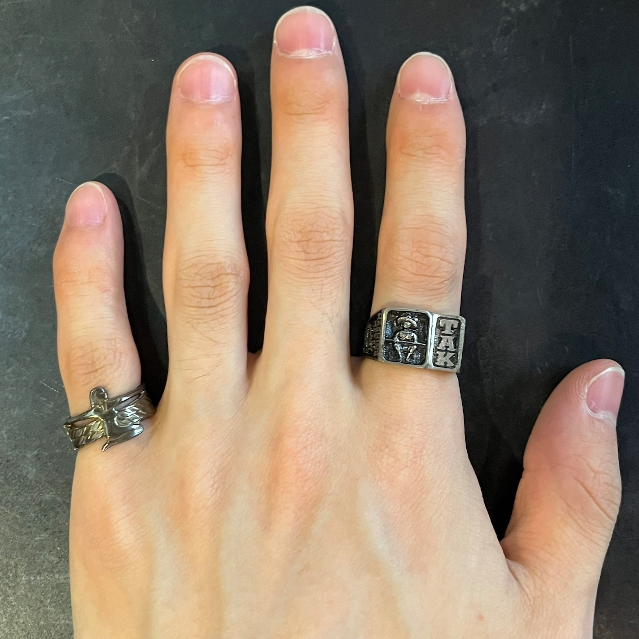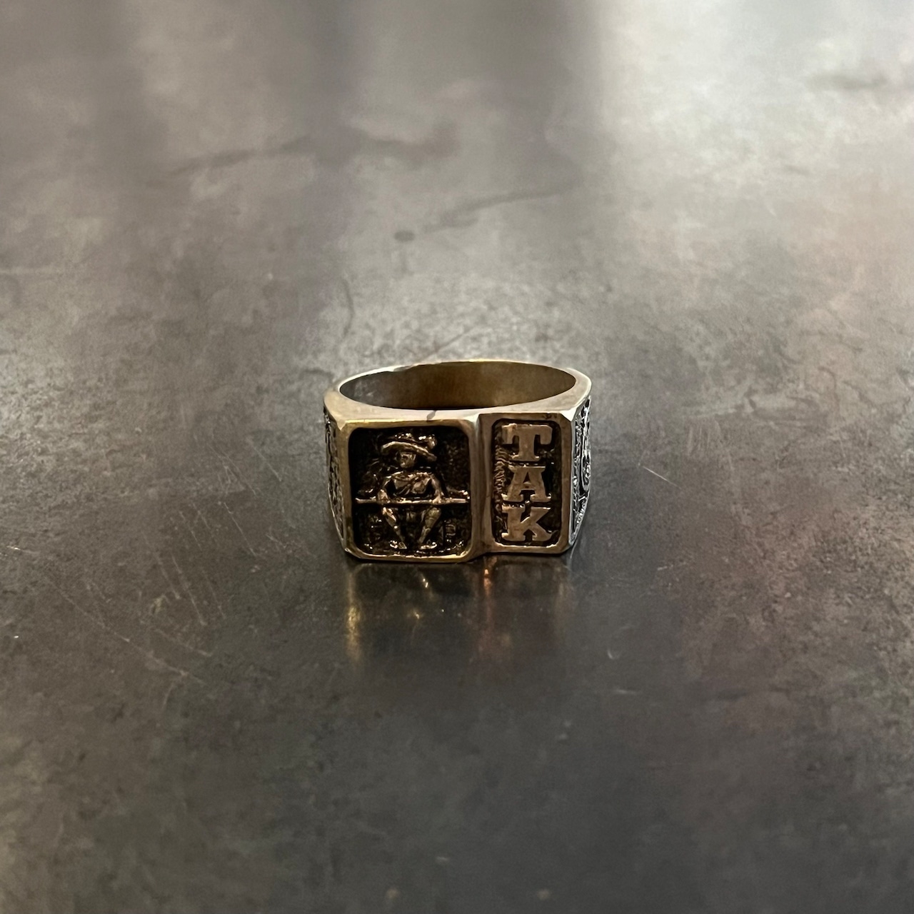 詳細は不明ですが、リング正面には「TAK」の文字が、もう一方には人の姿が立体的に彫り込まれており、独特な存在感とミステリアスな雰囲気を放っています。