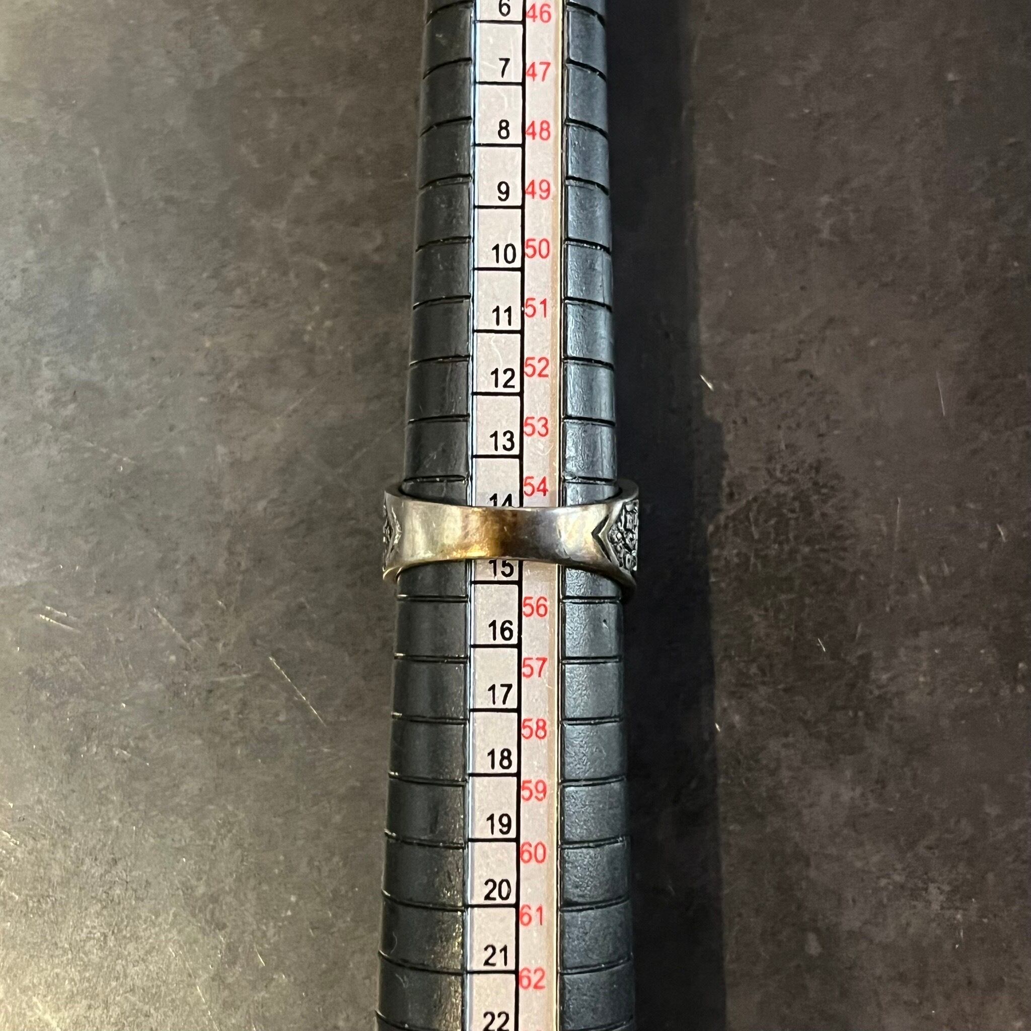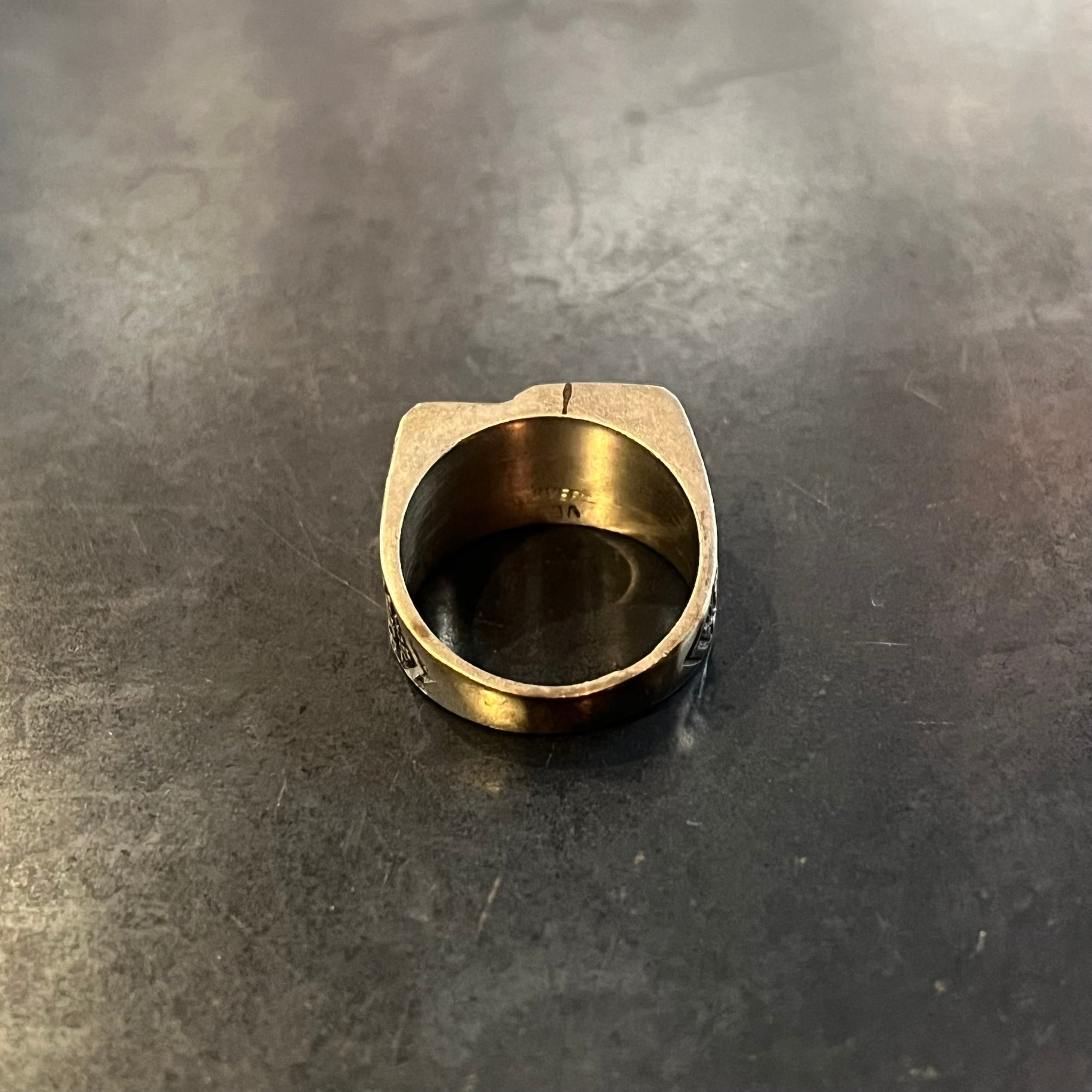 リングの側面にも彫刻が施されており、細部にまでデザインへのこだわりが感じられる造りで、経年によるくすみや程よい褪色感も雰囲気抜群の逸品です。
