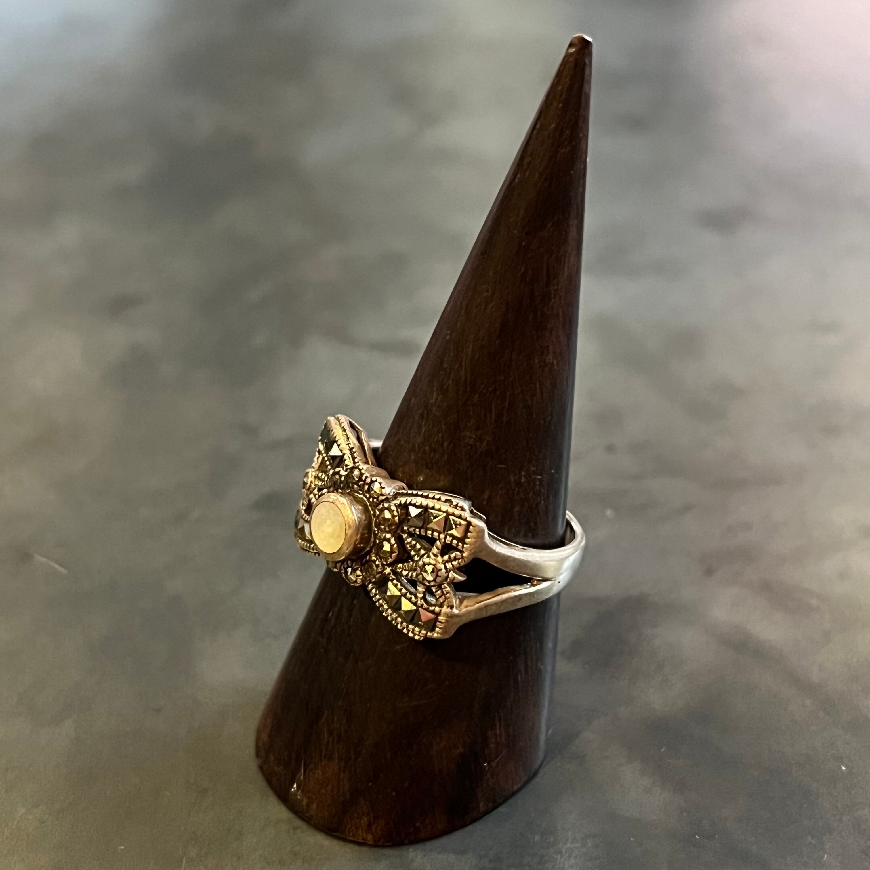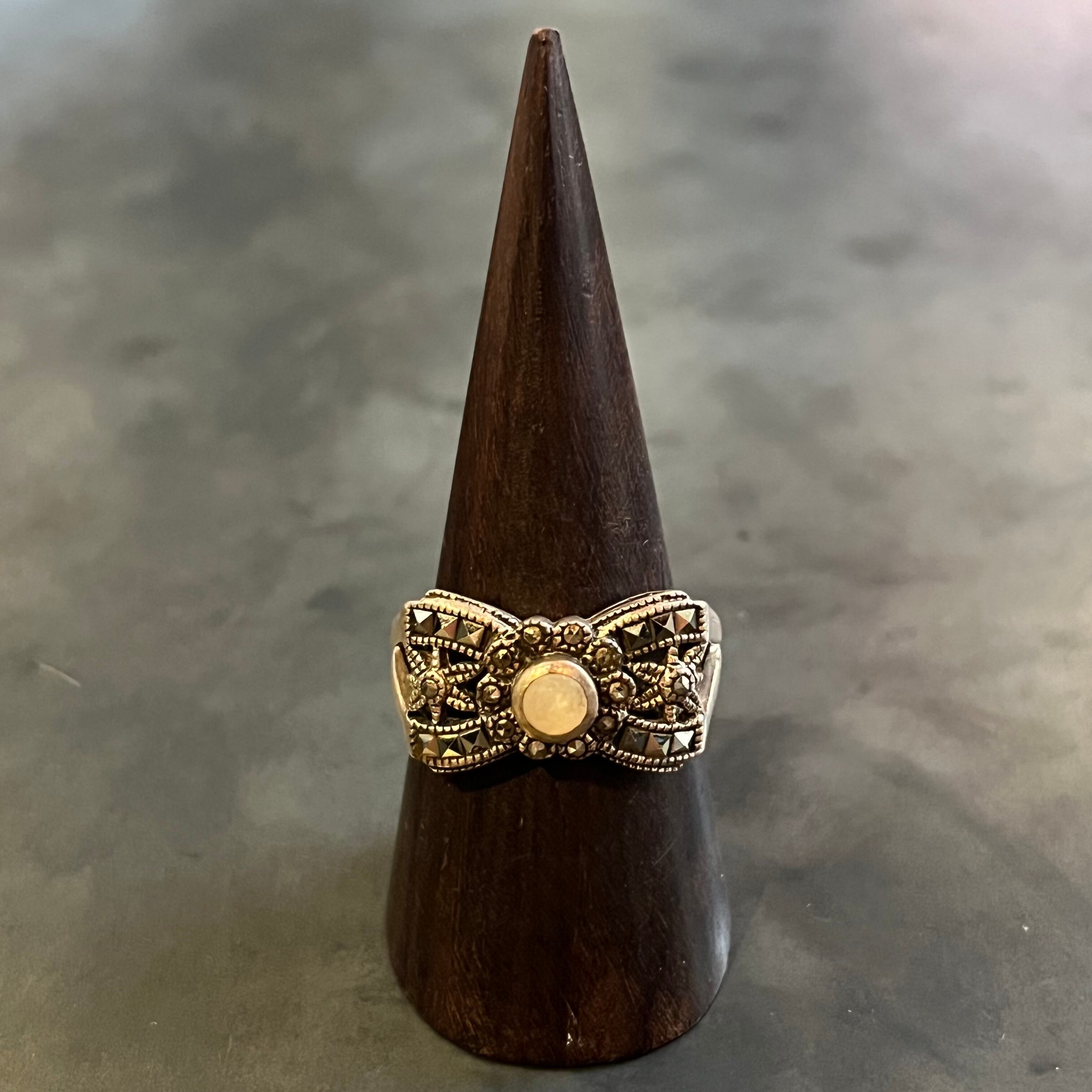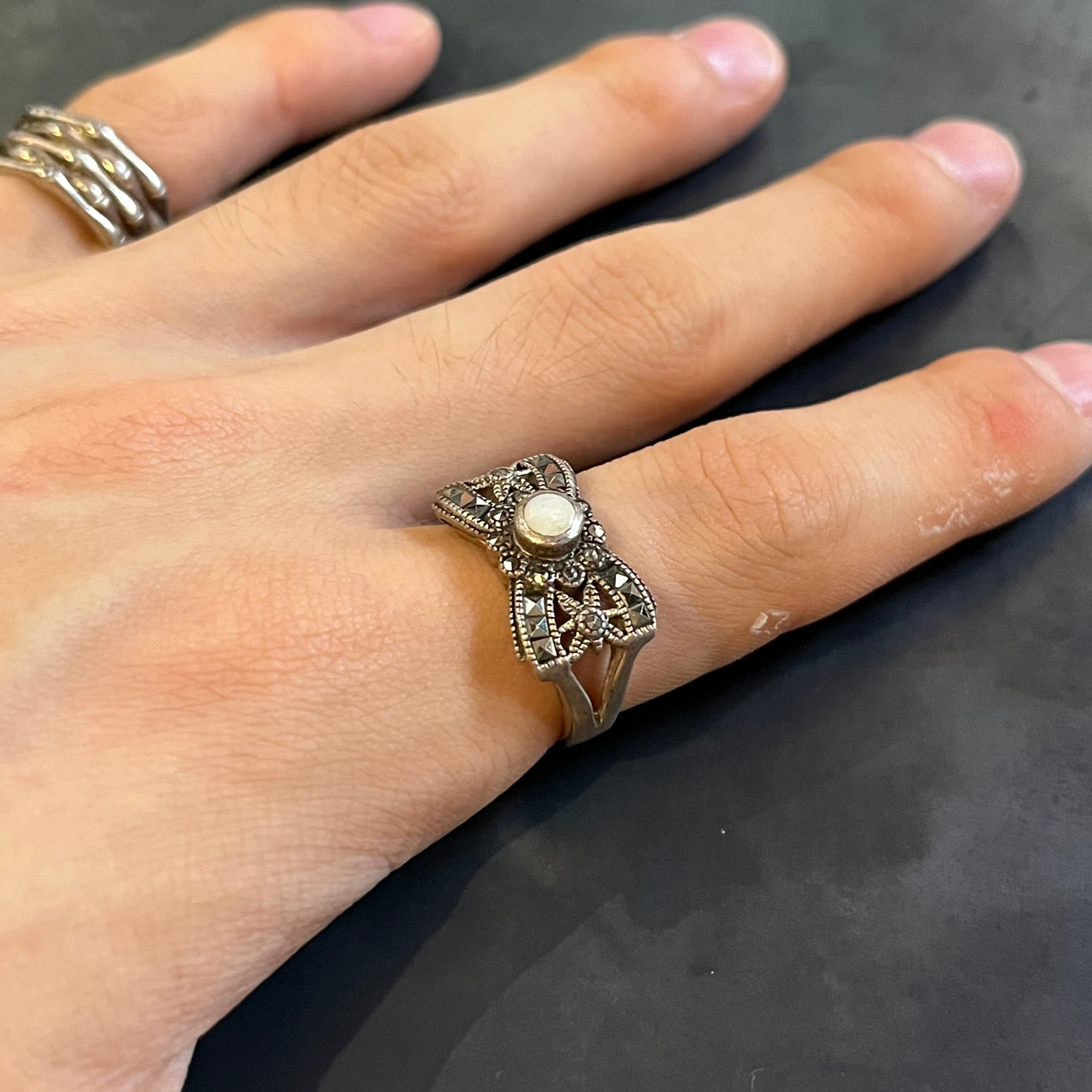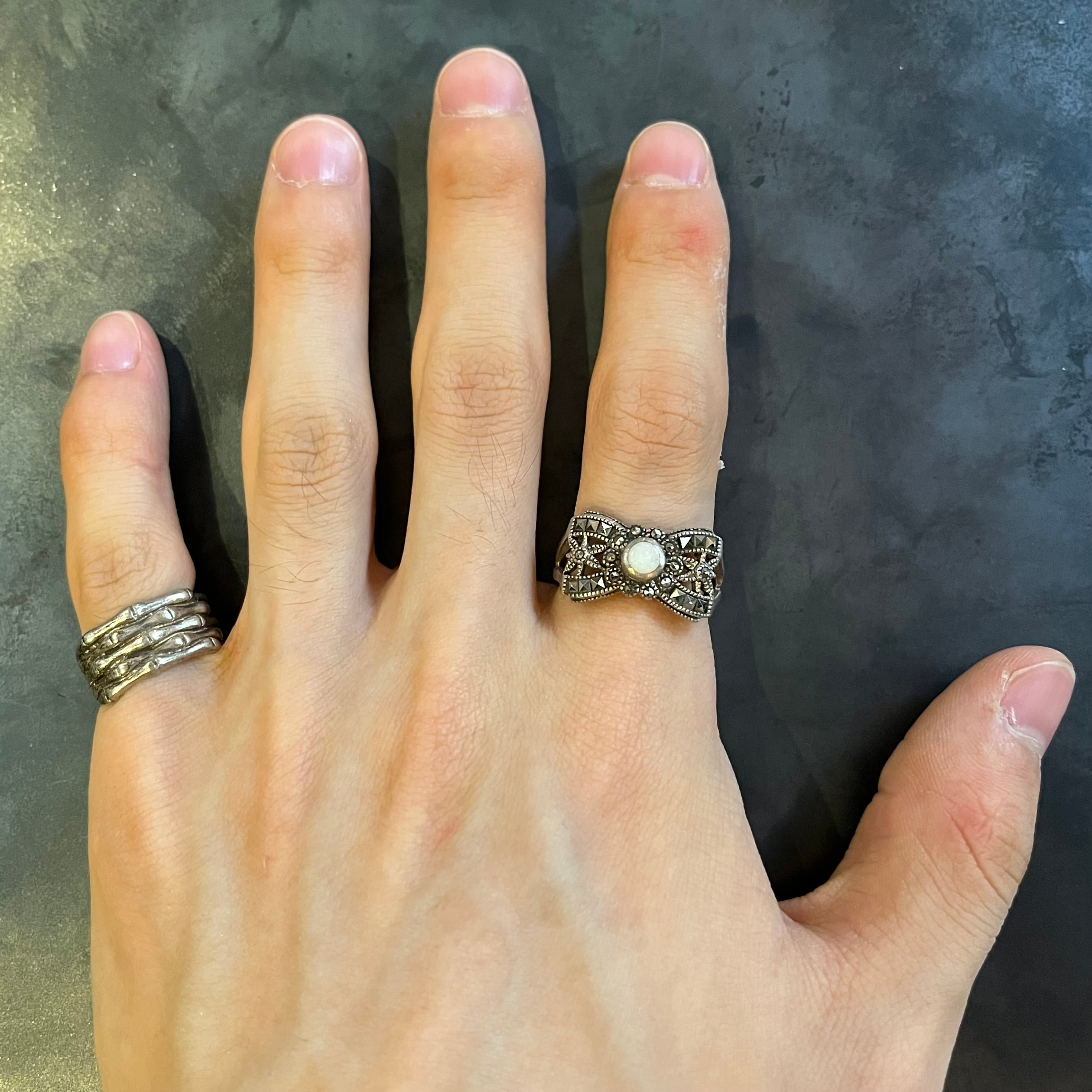 海外で買い付けたリボンモチーフグリッターデザインのシルバーリングです。