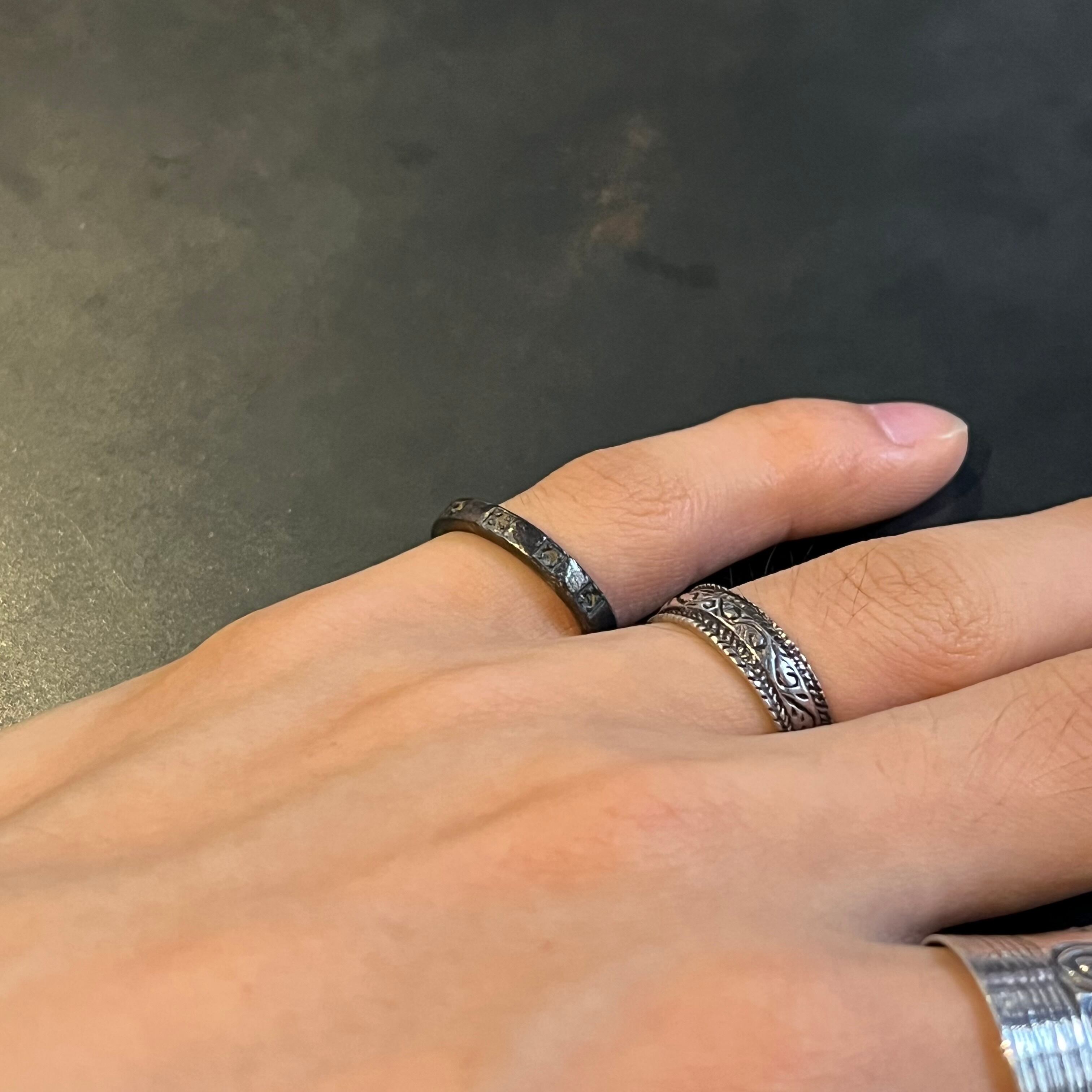 海外で買い付けたスクエアエングレービングデザインのシルバーリングです。