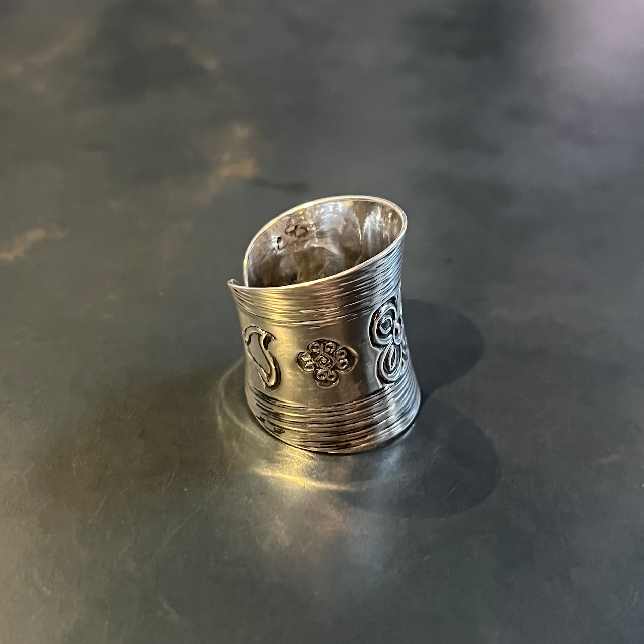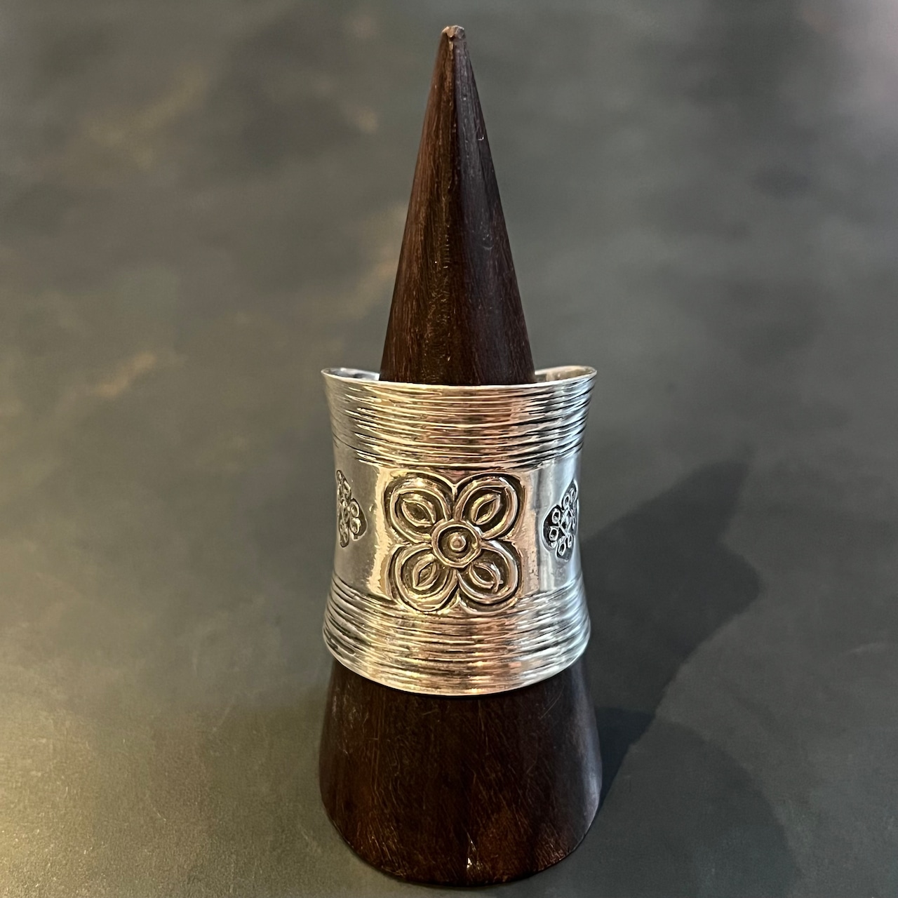 海外で買い付けたビッグ・フラワーモチーフ・スーパーワイド・トライバルデザインのシルバーリングです。