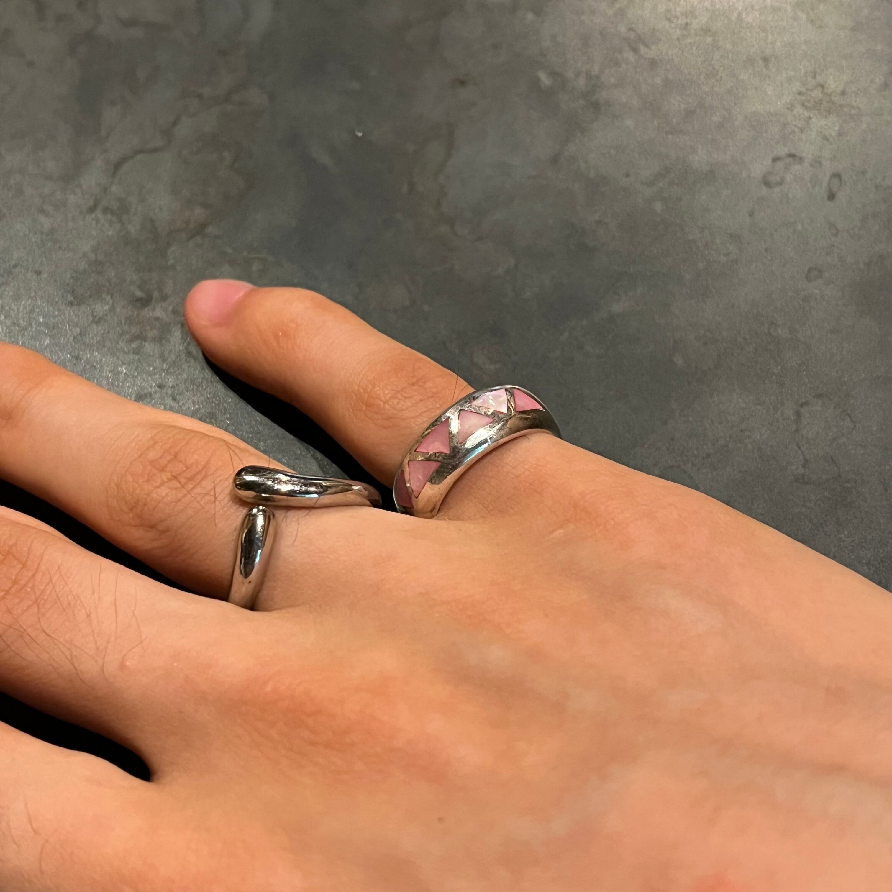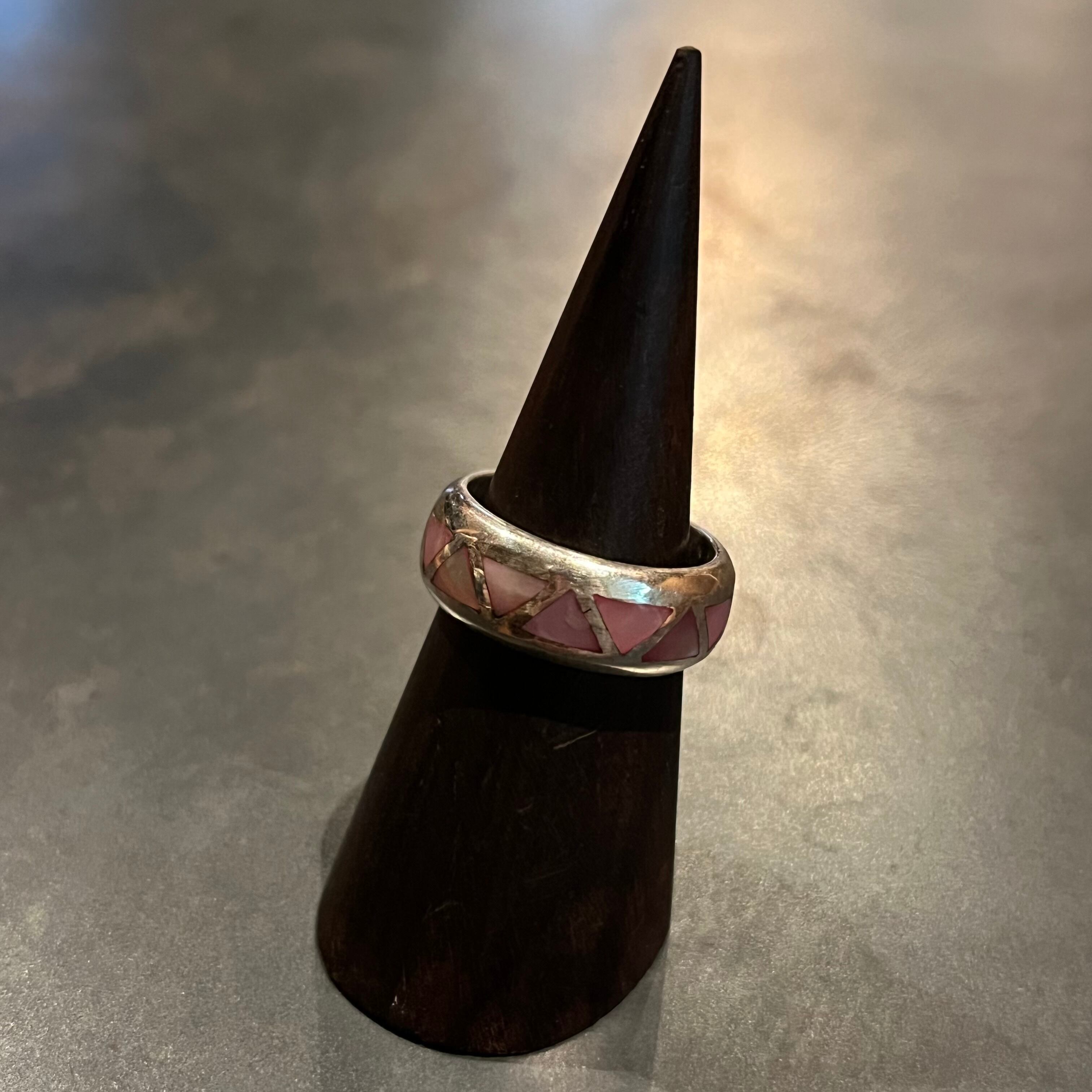 海外で買い付けたピンクストーンインレイデザインのシルバーリングです。
