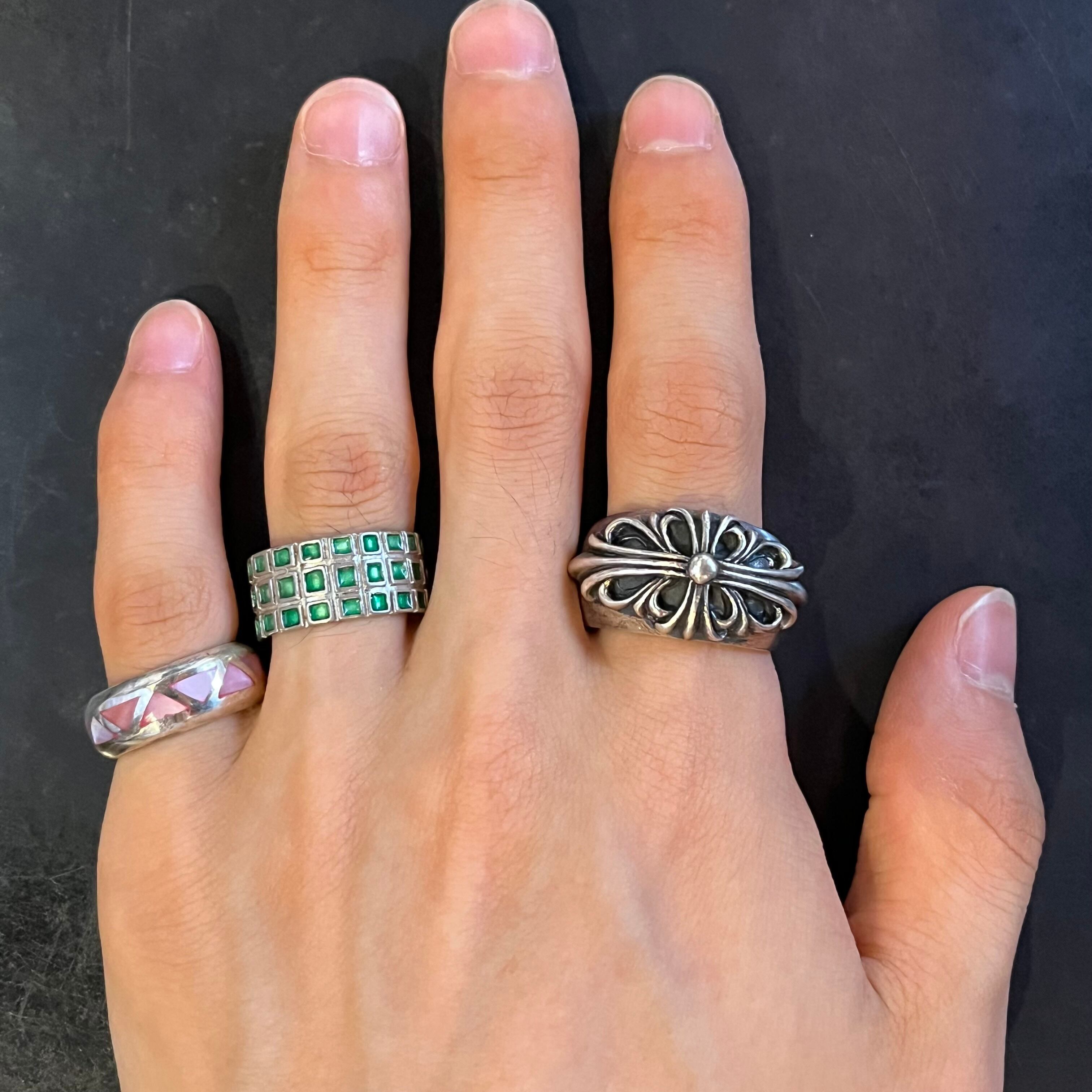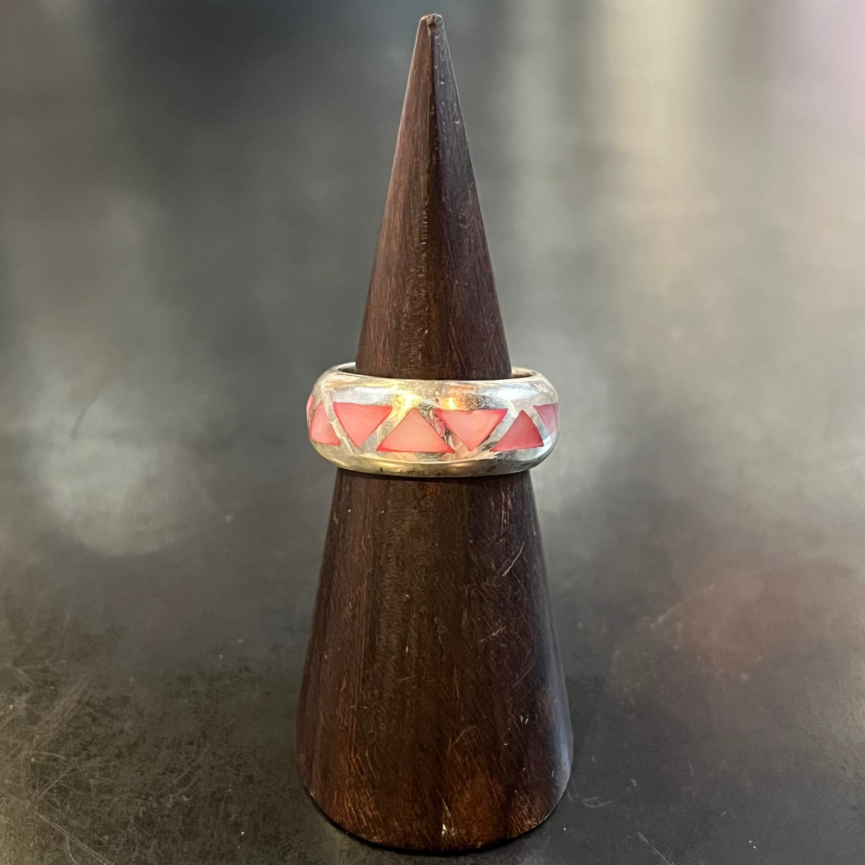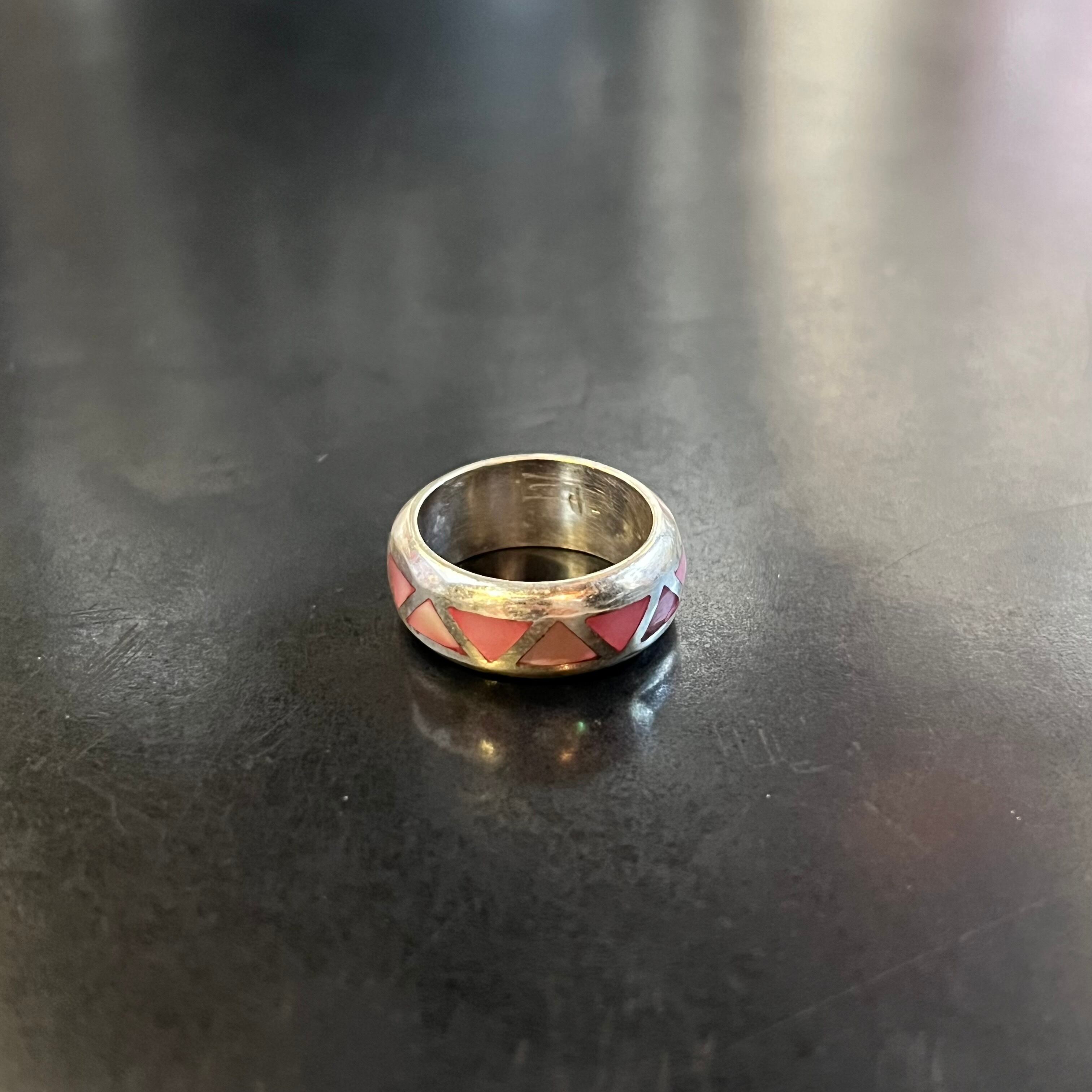 海外で買い付けたピンクストーンインレイデザインのシルバーリングです。