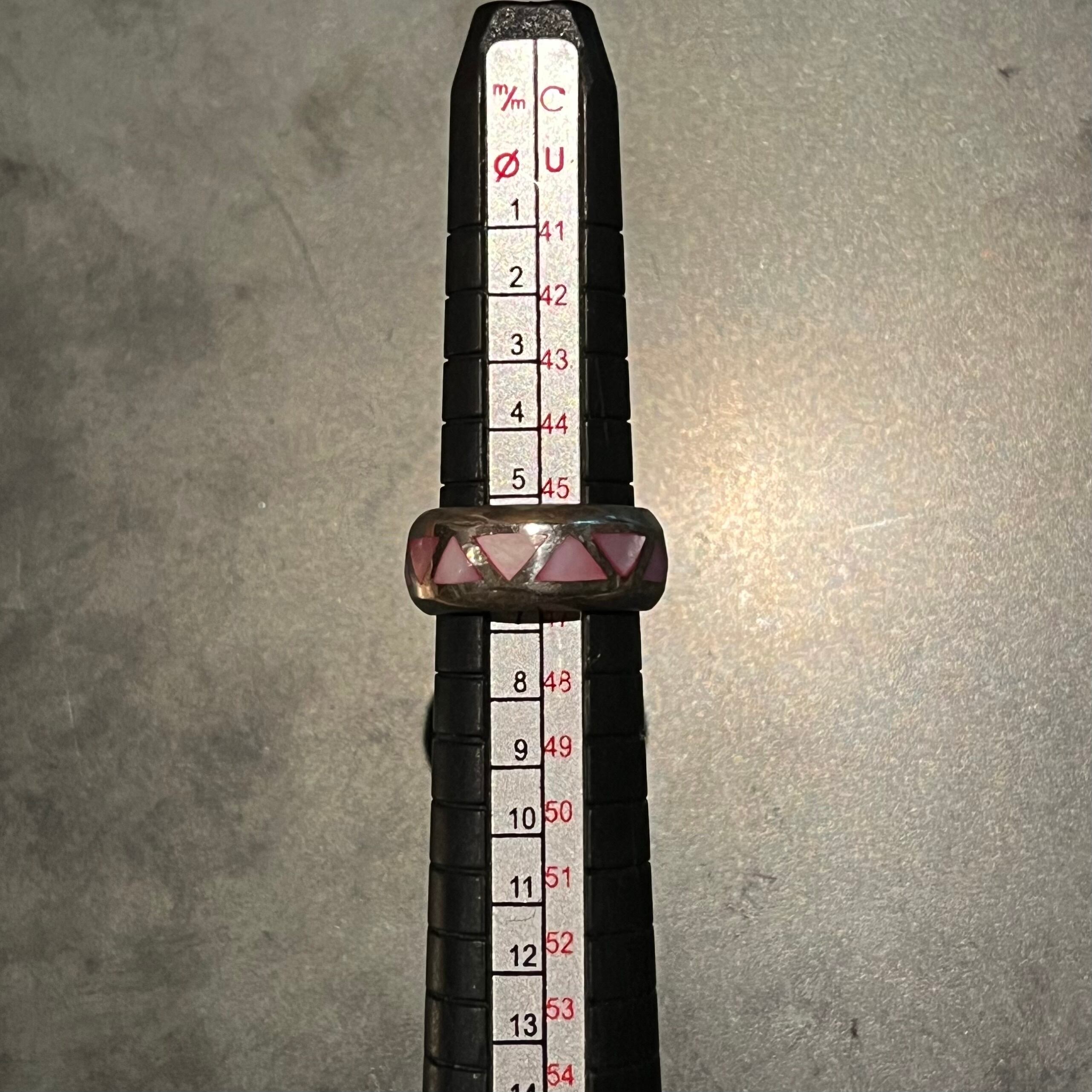 海外で買い付けたピンクストーンインレイデザインのシルバーリングです。