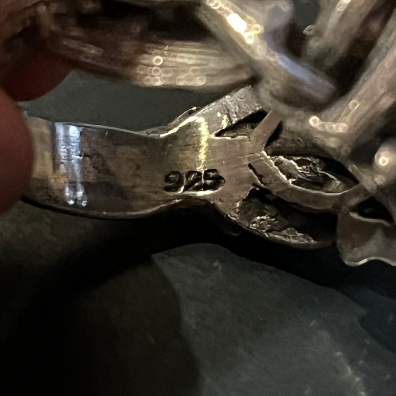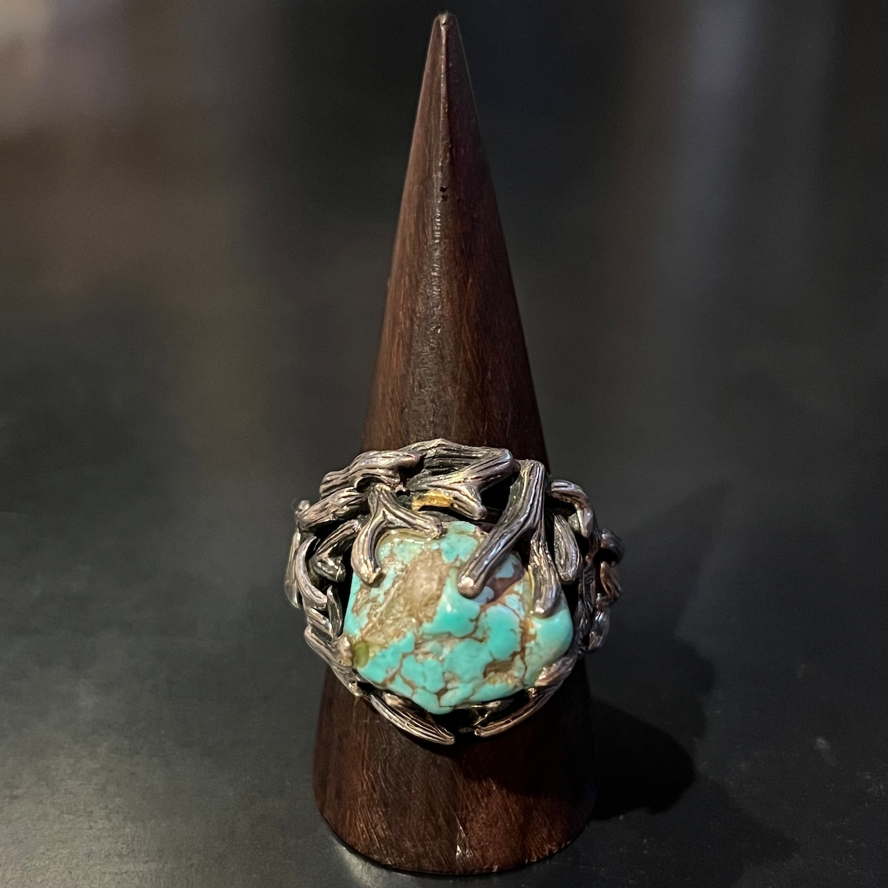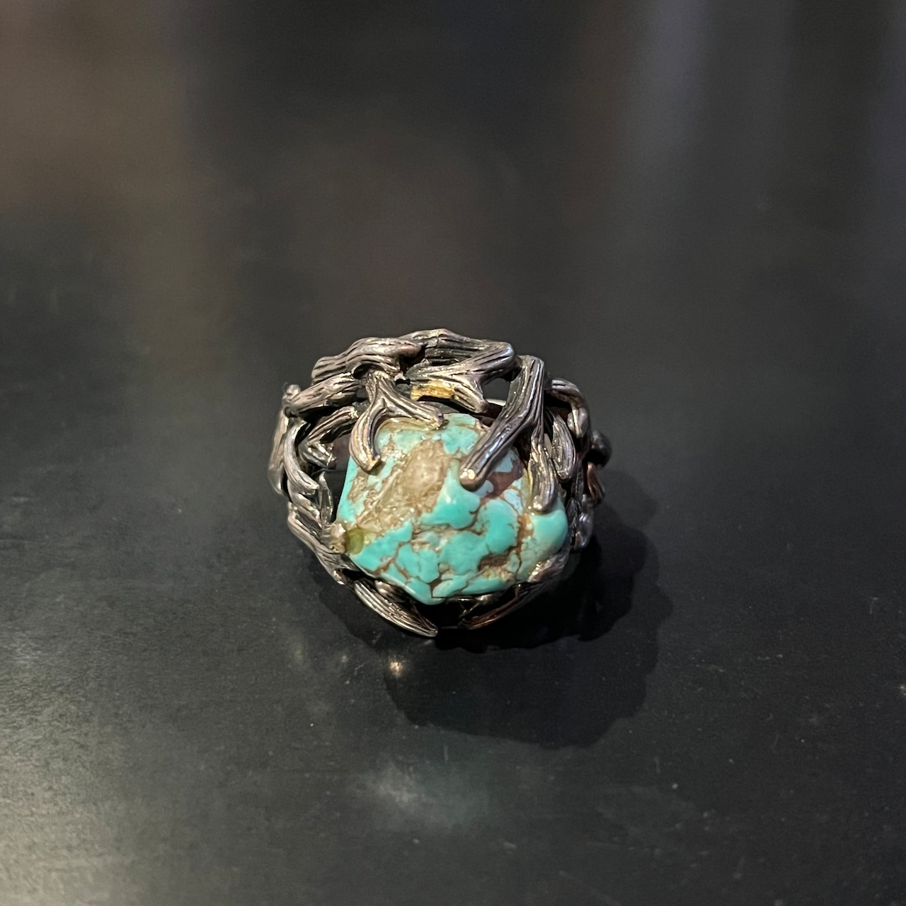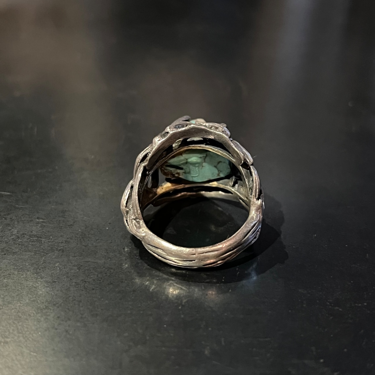 海外で買い付けたビッグターコイズストーンモチーフネイティブデザインのシルバーリングです。