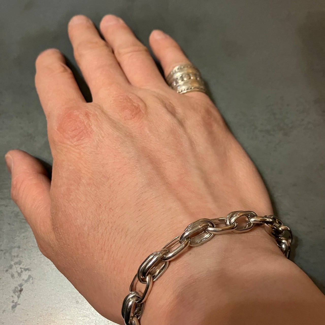 手首周り16㎝でちょうど良いゆとりがある程度です。(チェーン部分で多少調節可能)