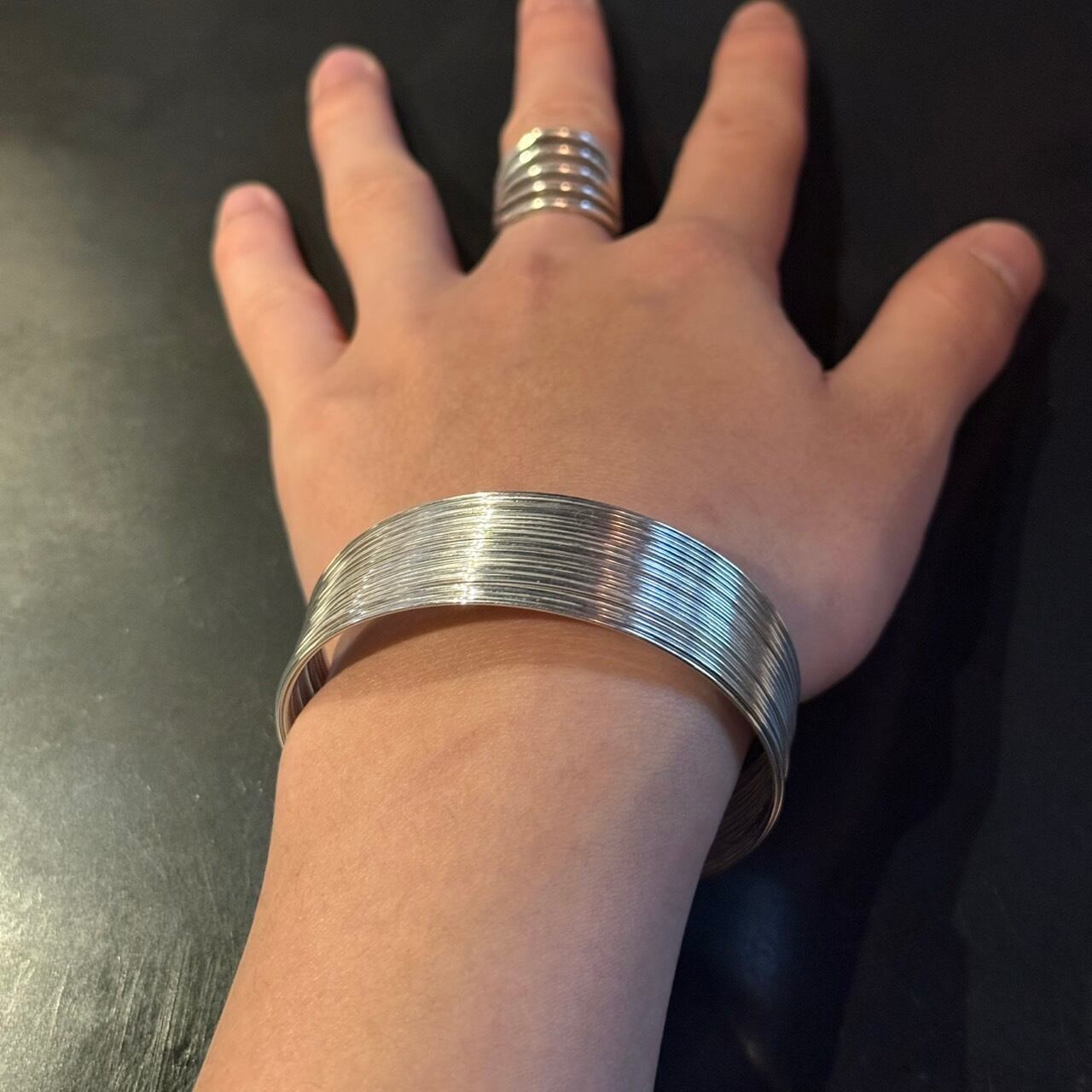 details:海外で買い付けたシルバーワイドデザインバングルです。大振りデザインですので、一つ付けるだけでインパクトが出ます。この機会にいかがでしょうか?