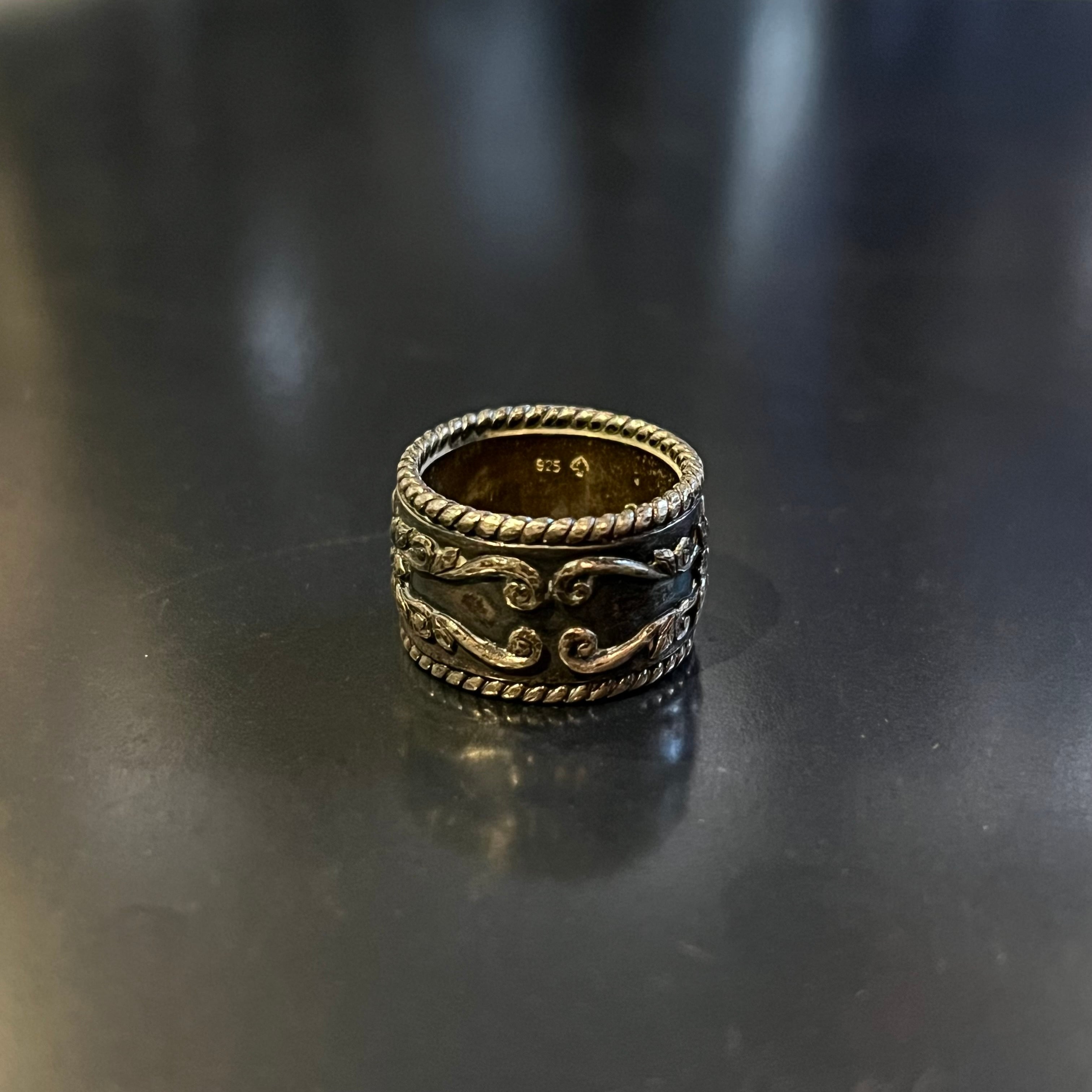 海外で買い付けたフラワーモチーフスワールデザインのシルバーリングです。