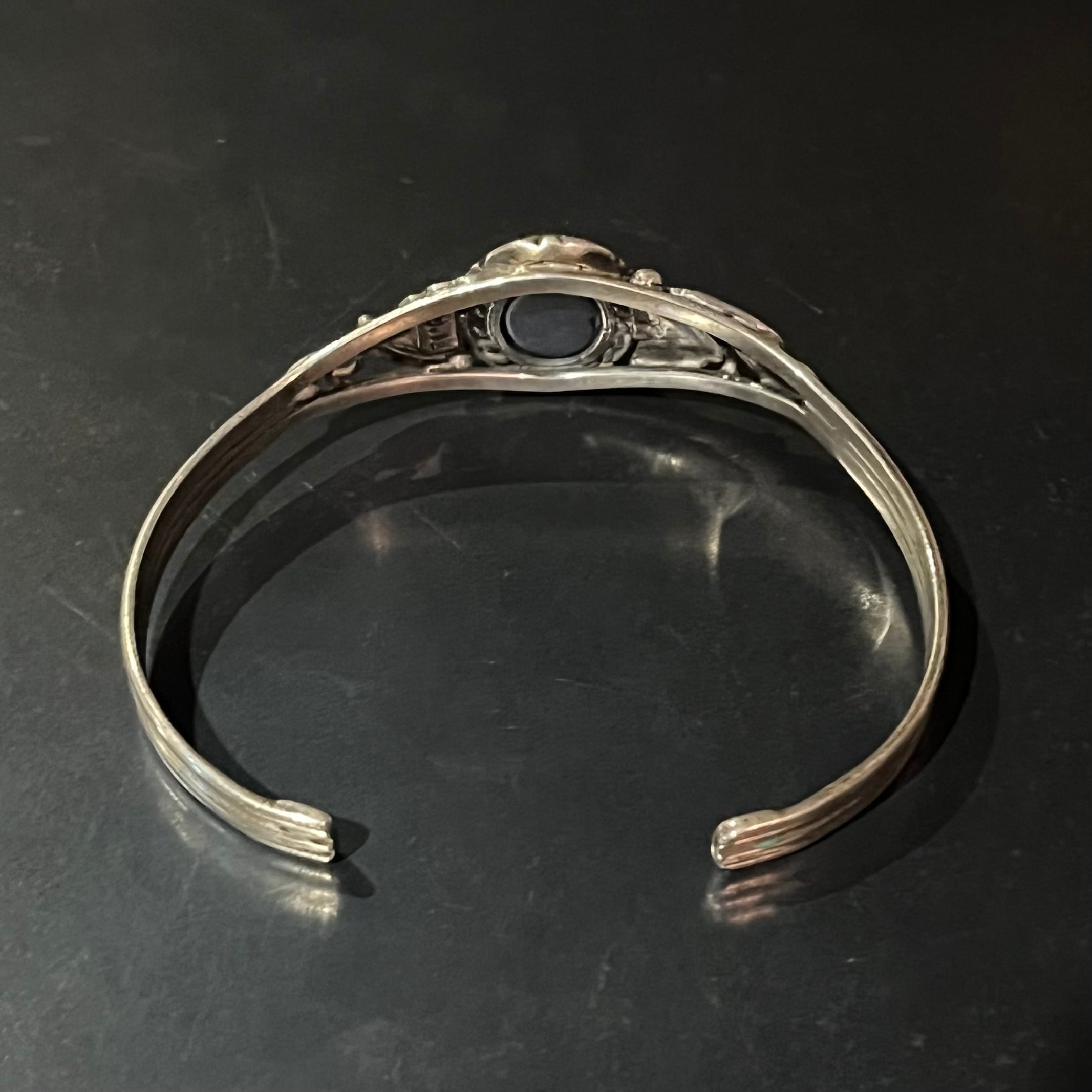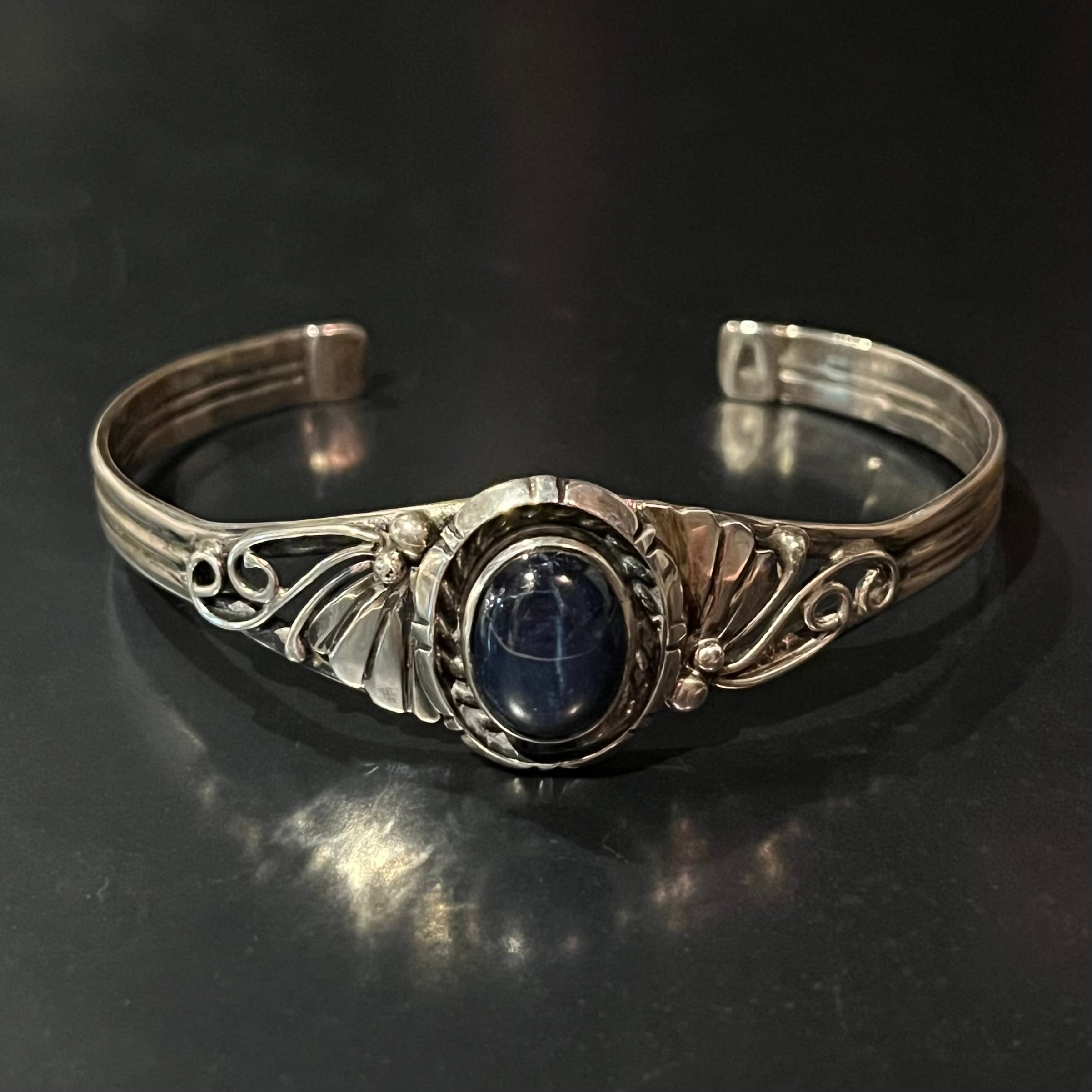 海外で買い付けたナバホ族・サファイアストーン・ネイティブデザインのシルバーバングルです。