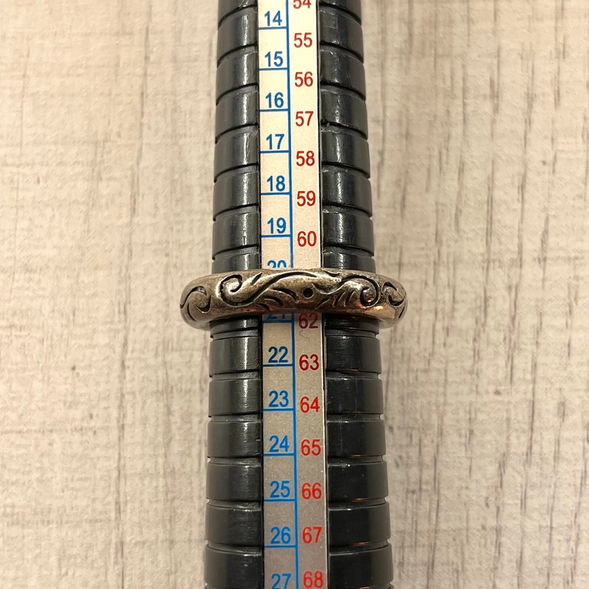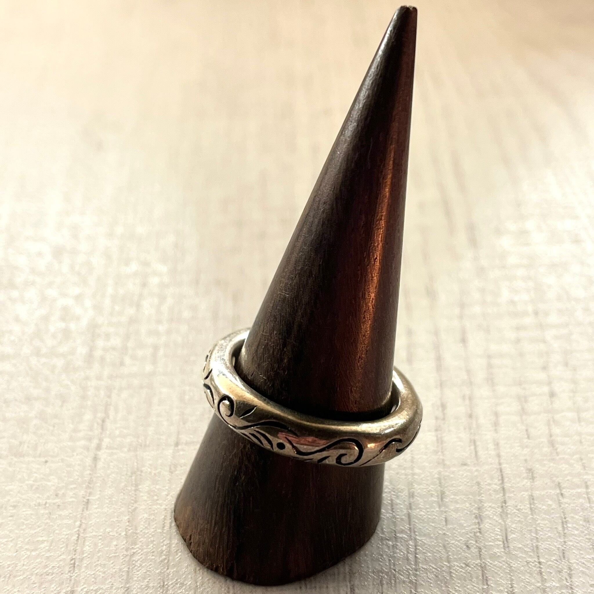 ネイティブテイストを感じさせるデザインが、指元に力強い存在感を与えてくれる逸品です。伝統的な雰囲気とシルバーの重厚感が融合した佇まいで、スタイリングのアクセントとして活躍します。
