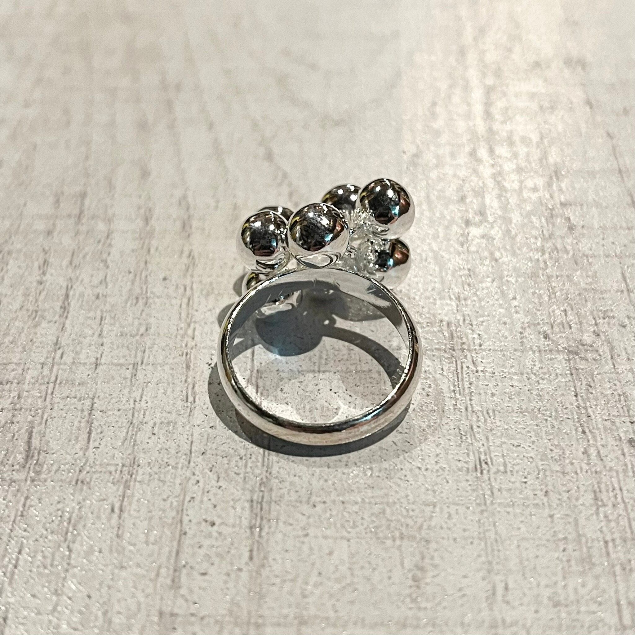 大きさの異なるシルバーの球体を束ね、泡のようなデザインで遊び心のあるリングです。中央には細かなテクスチャが施されており、指先を優しく華やかに彩る逸品です。
