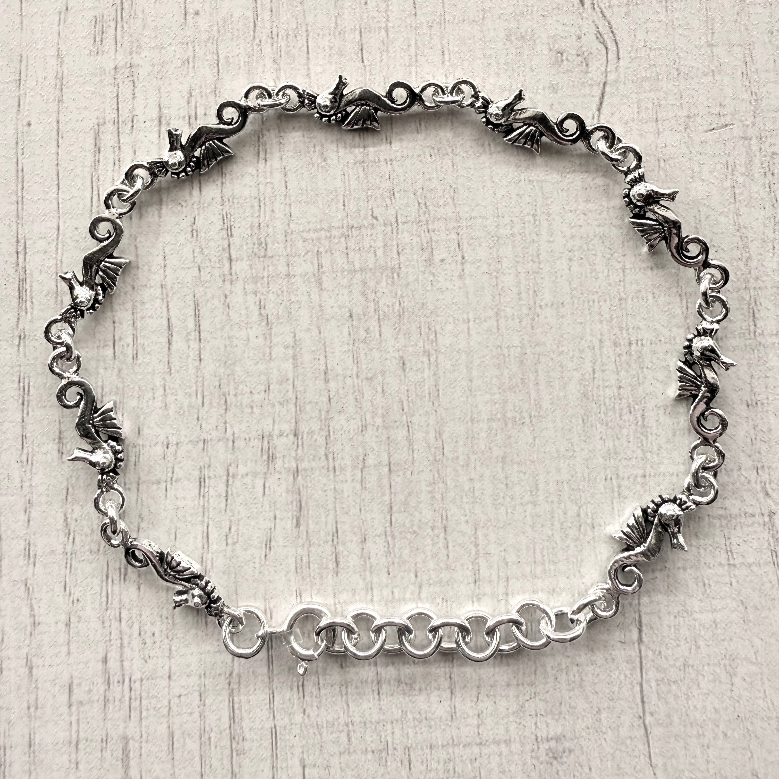 繊細にデザインされたシーホース(タツノオトシゴ)モチーフをあしらった、個性と上品さを兼ね備えたチェーンブレスレットです。