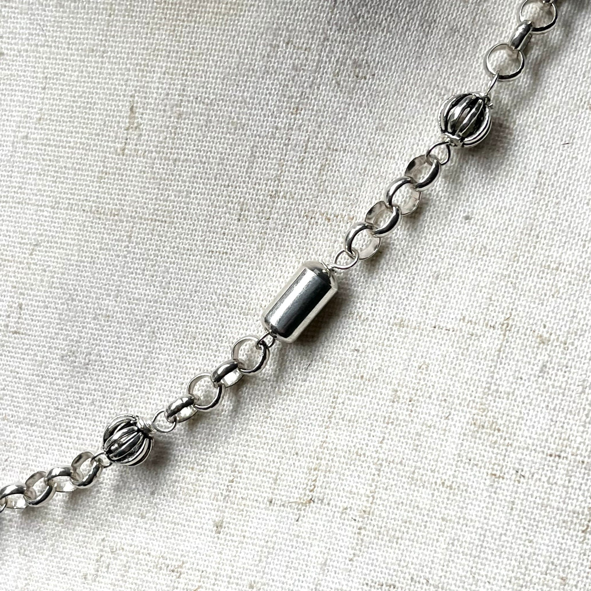 ユニークなモチーフが連なったラウンドチェーンで、アクセントの効いたデザインですが、控えめなボリューム感と滑らかなシルバーの輝きが、全体を程よく華やかな印象にまとめており、幅広いスタイルで活躍する逸品です。
