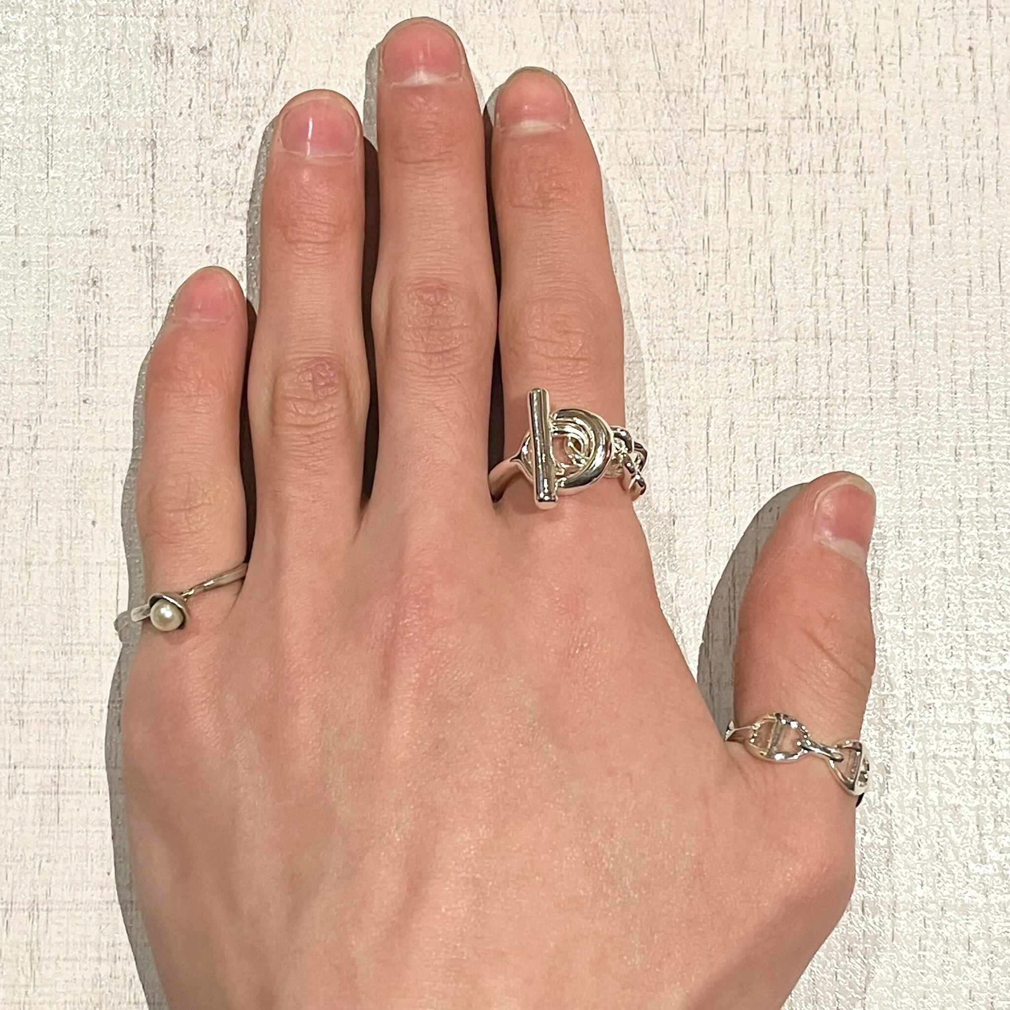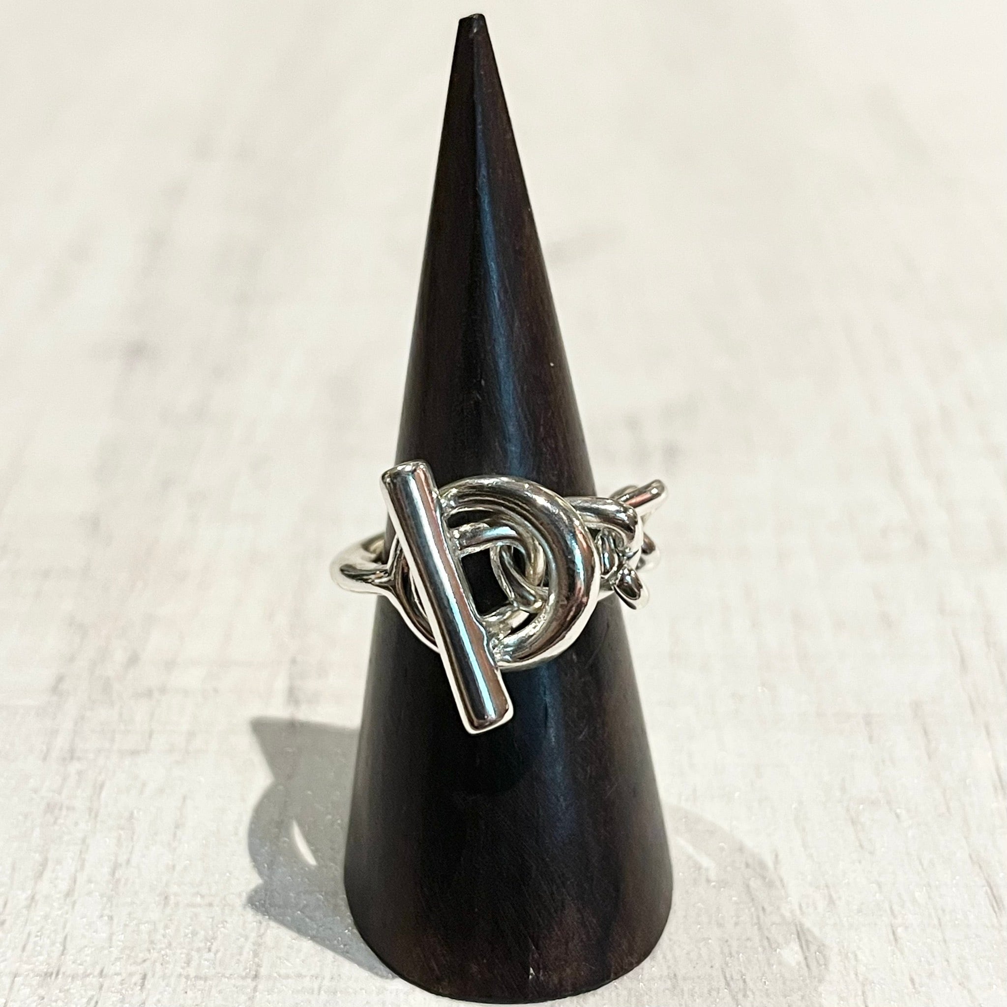 マンテルをモチーフにした、遊び心溢れるユニークなリングです。立体的に交差するチェーンとマンテルの組み合わせが程よくアクセントの効いたデザインで、幅広いスタイルの装いにマッチする逸品です。