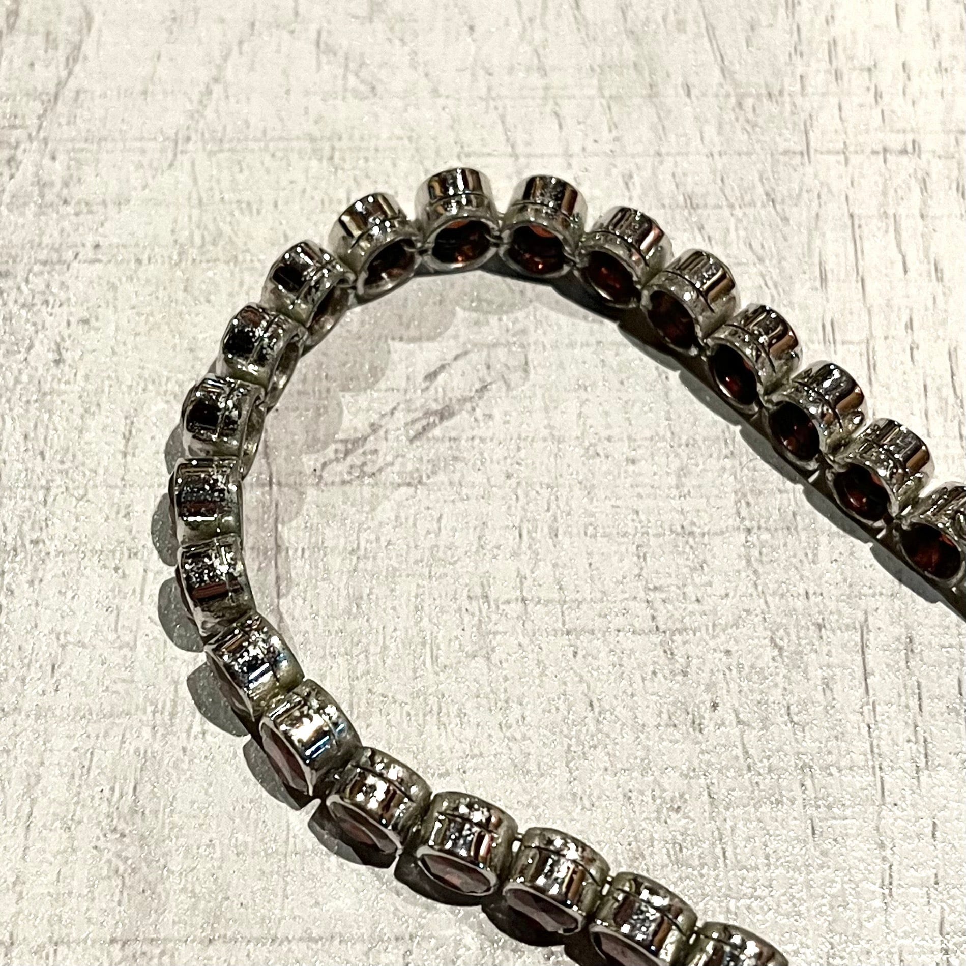 深く神秘的な輝きを放つ、オーバルカットのレッドストーンを贅沢に配したテニスブレスレットです。雰囲気抜群のワインレッドの色彩と、テニスチェーンの放つ輝きに存在感がある、主役級の逸品です。