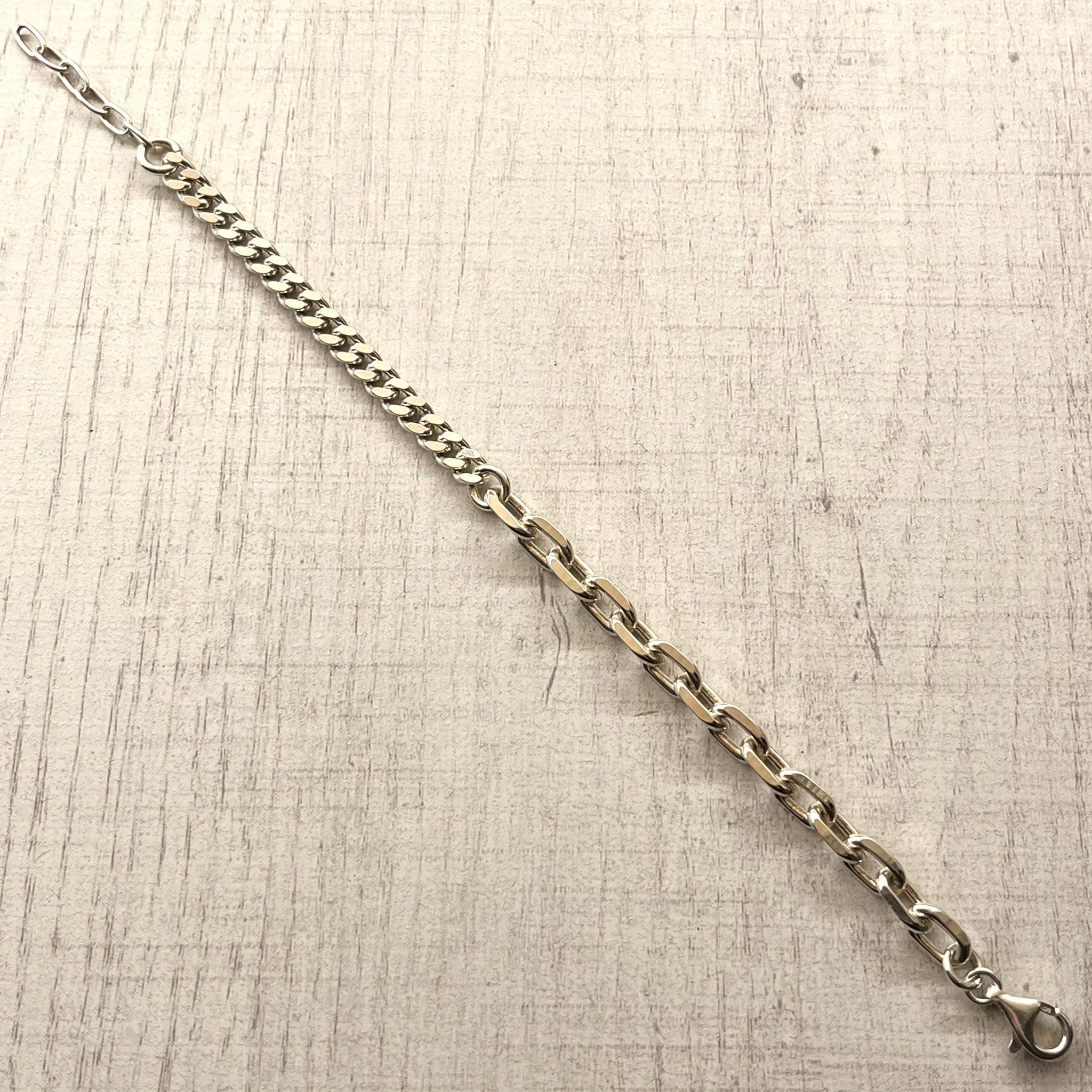 重厚感のある喜平チェーンと、抜け感のあるオーバルチェーンを1本に凝縮した、遊び心あふれるミックスチェーンブレスレットです。全体的に程よいボリュームがあり、手首にしっかりとした存在感を与えてくれる逸品です。