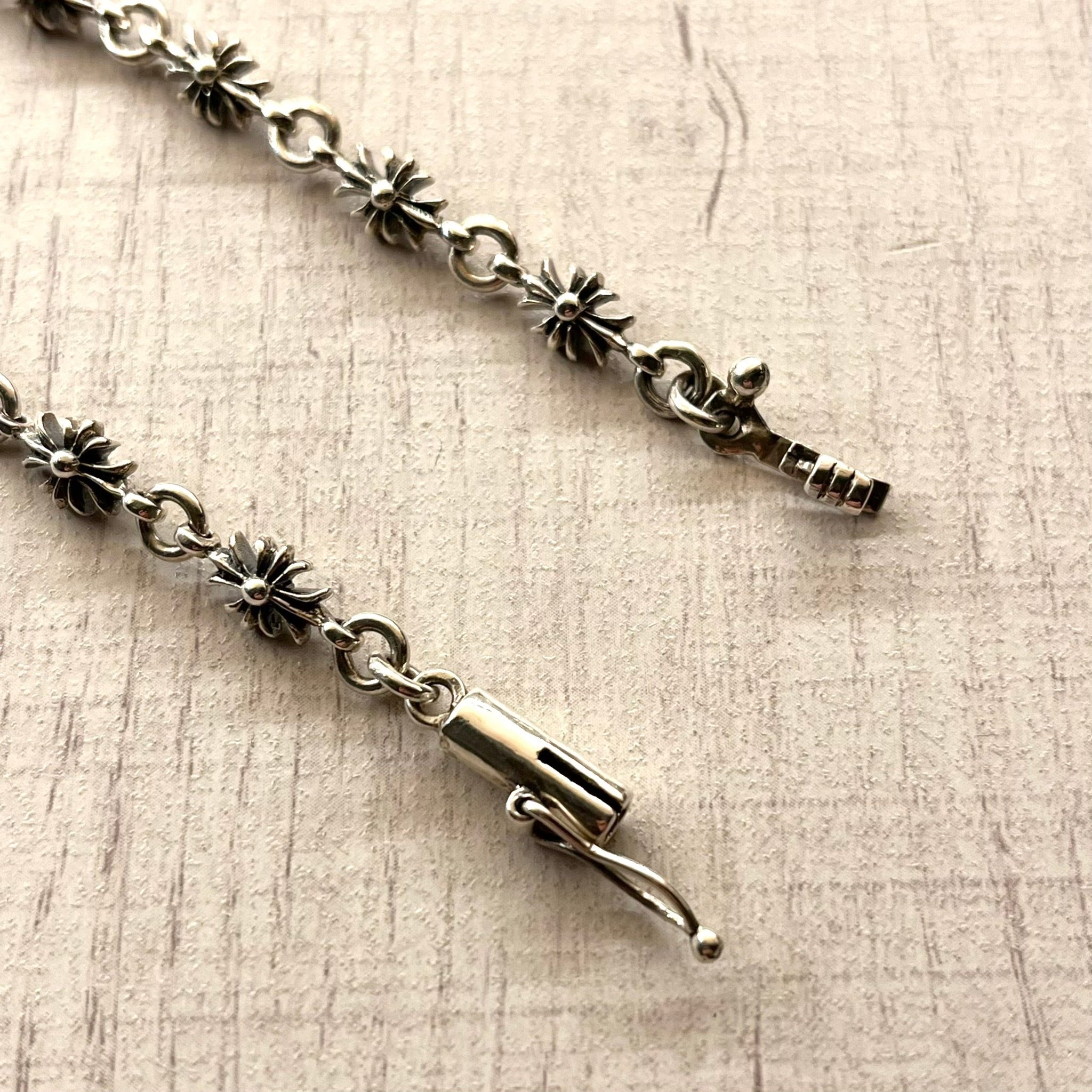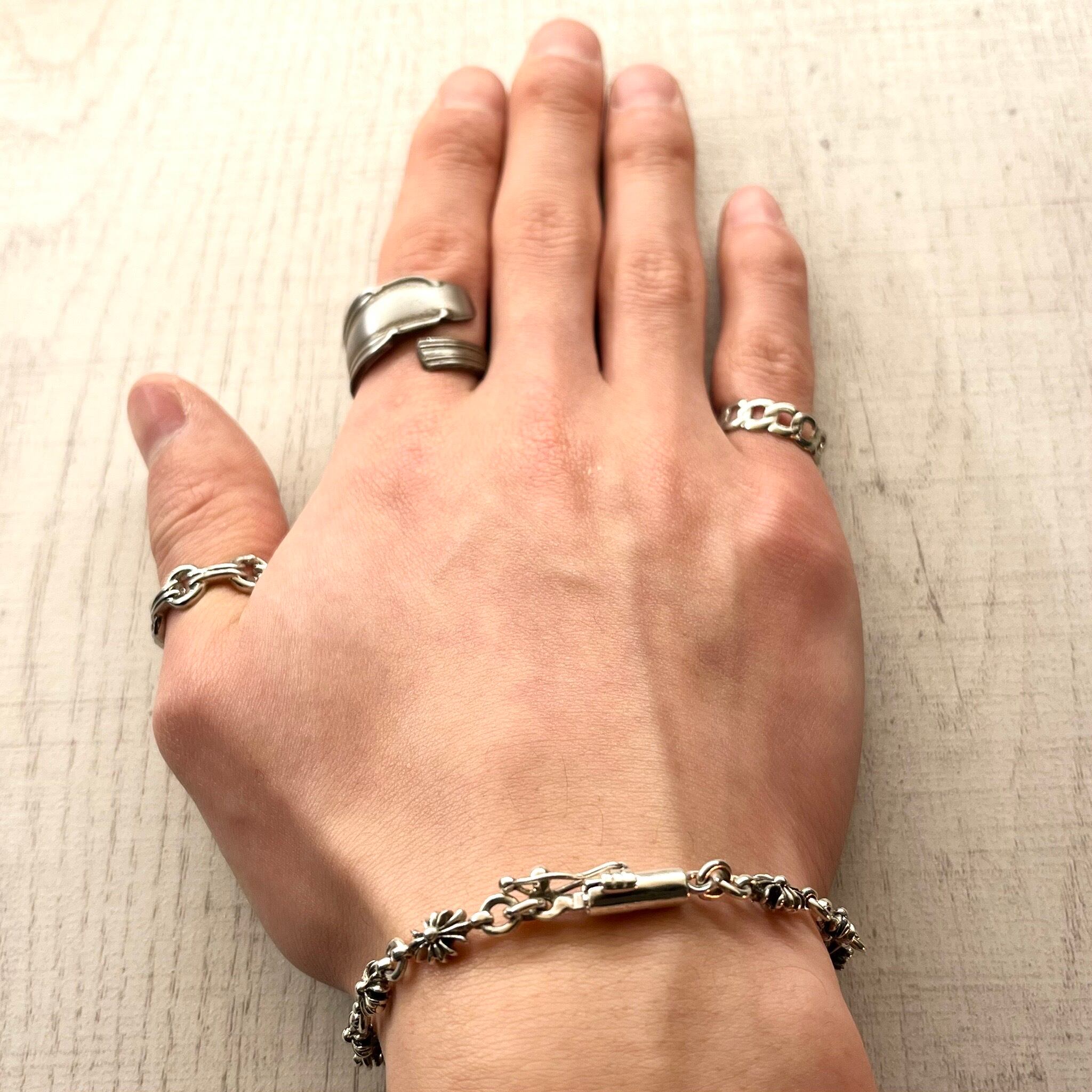 存在感のあるクロスモチーフを贅沢に繋ぎ合わせた、リンクチェーンブレスレットです。一つ一つのパーツが立体的に作り込まれており、シルバーの重厚な質感と滑らかな輝きが存分に感じられる、主役級の逸品です。