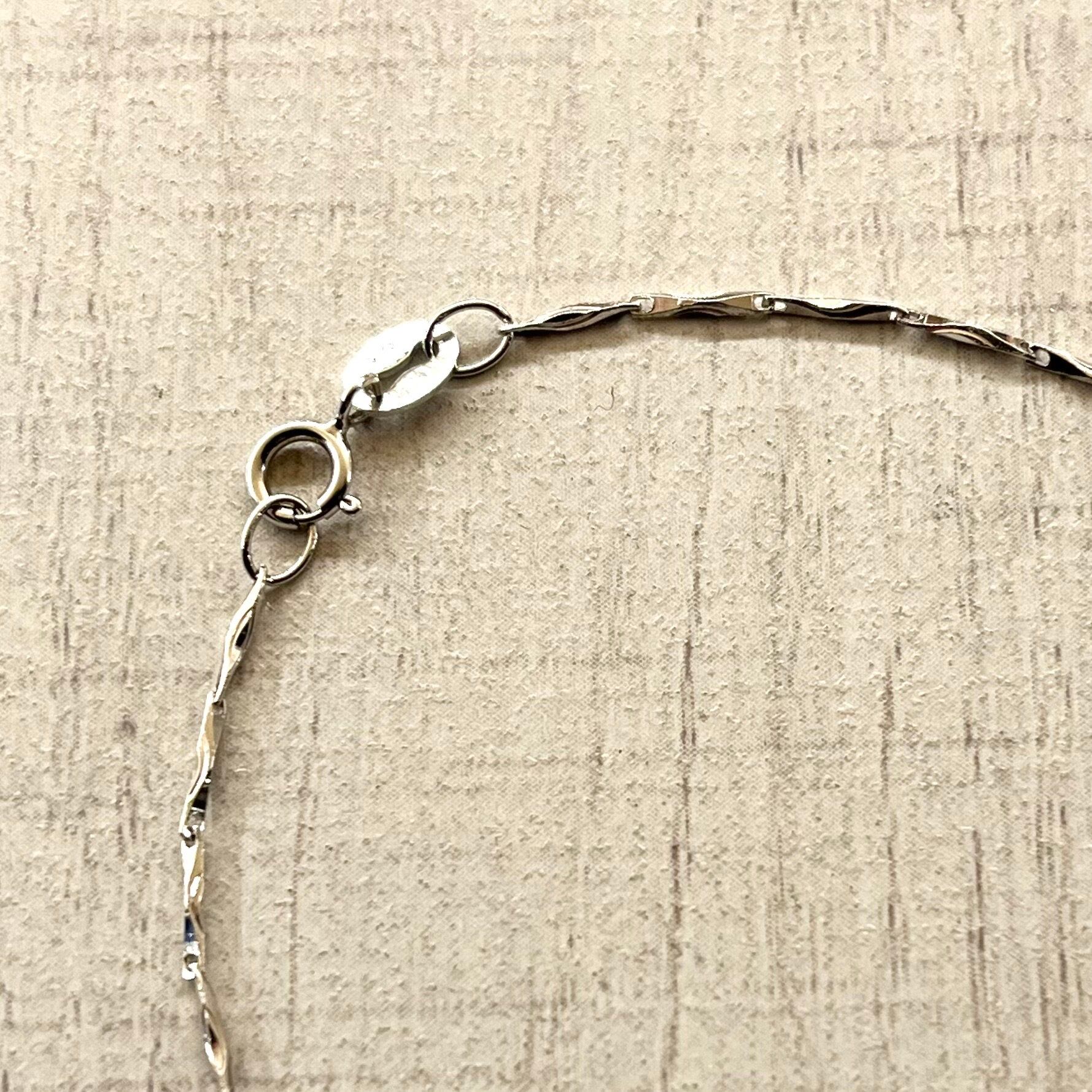 細身なツイストチェーンが、平たい面で光を反射し、独特の光沢を放ちます。ミニマルながらも、確かな輝きと存在感を放つ、洗練された印象の逸品です。