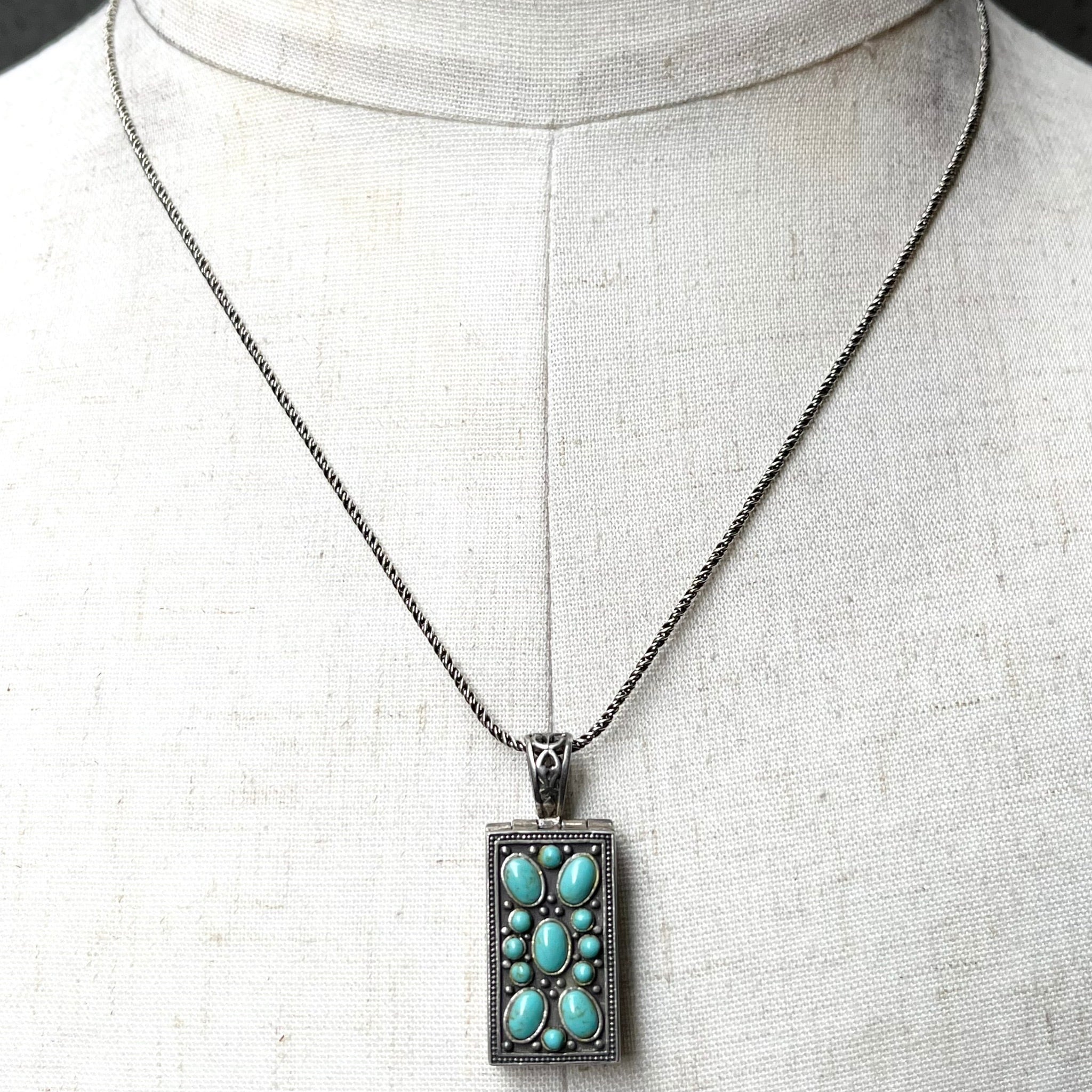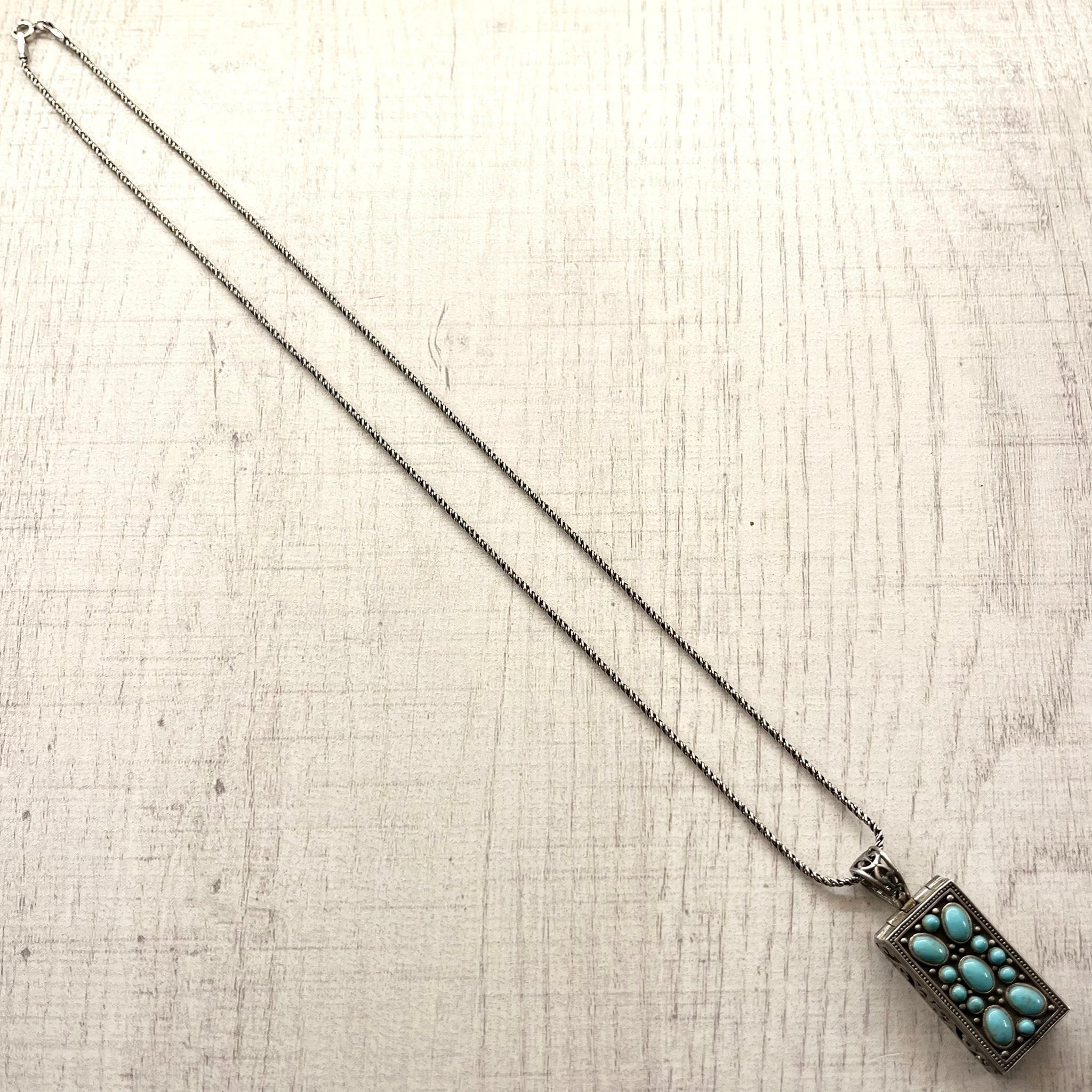 緻密に彫り込まれた装飾台座に、鮮やかなターコイズが散りばめられた、エキゾチックなペンダントネックレスです。内部には小さな写真や思い出を忍ばせることができ、しなやかなロープチェーンがペンダントの存在感をしっかりと支えています。長方形のトップには大小のターコイズがバランス良く配置されており、雰囲気抜群のデザインで、主役級の逸品です。