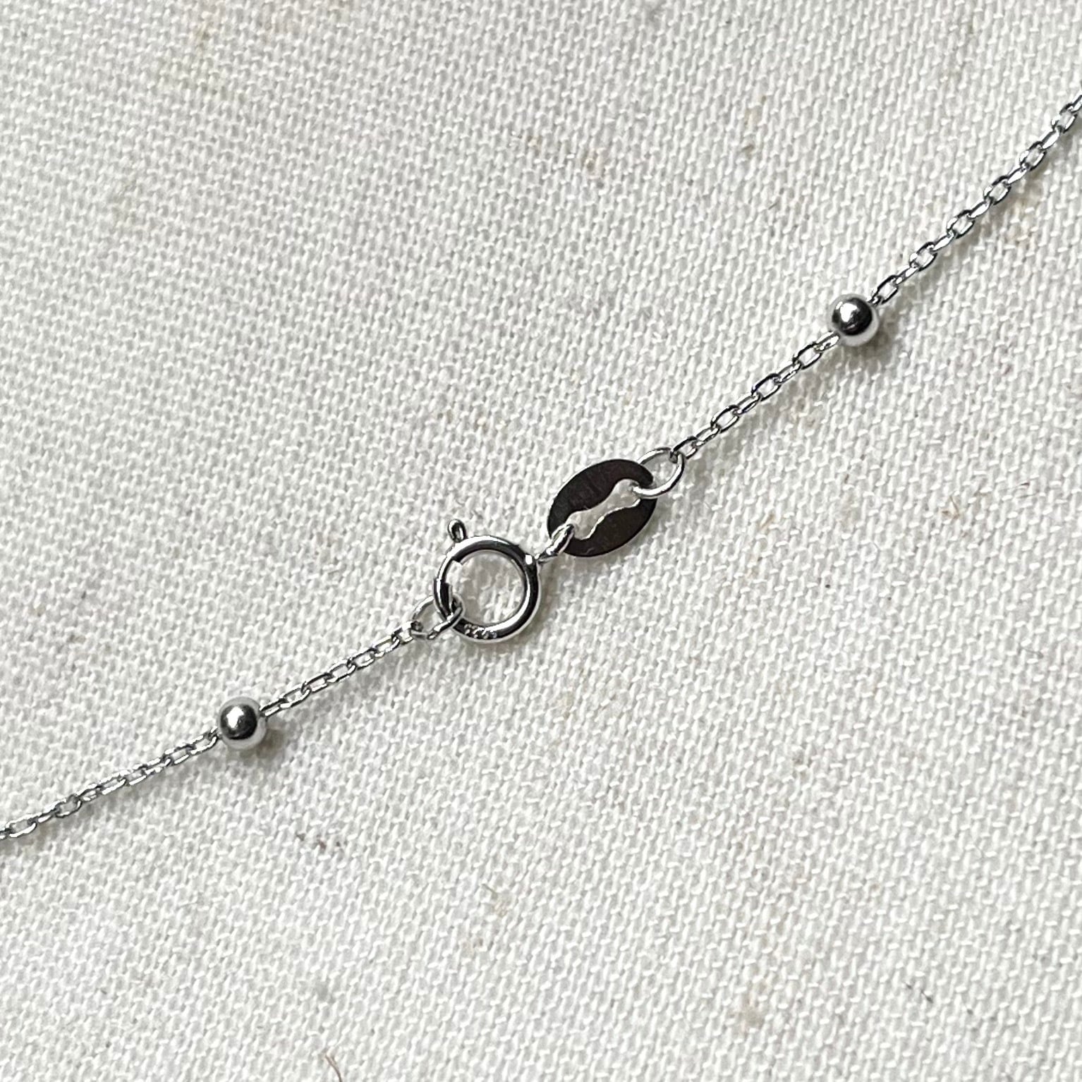 華奢なシルバーチェーンに、一定の間隔で小さなボールパーツを配置した華やかなデザインです。プレーンなチェーンよりもリズム感があり、程よく抜け感のある繊細な雰囲気の逸品です。
