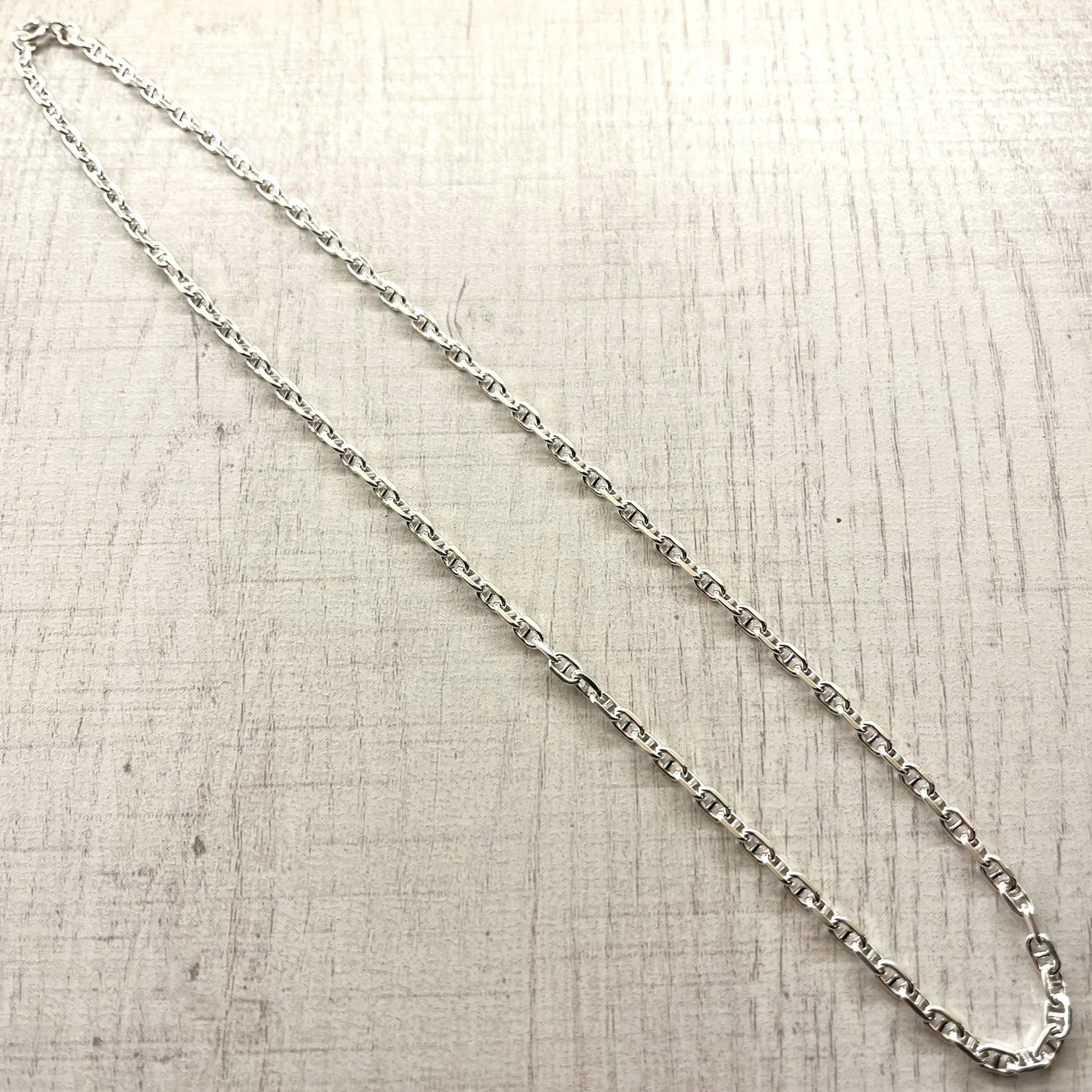 高級感のあるシルバーが、重厚で滑らかな輝きを放ちます。クラシックなデザインのアンカーチェーンが雰囲気抜群で、洗練された光沢が美しい逸品です。