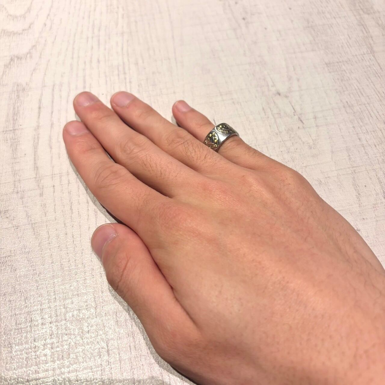 重厚感のあるシルバーのワイドバンドに、愛らしいハートモチーフを大胆に彫り込んだ、ヴィンテージ感漂うリングです。