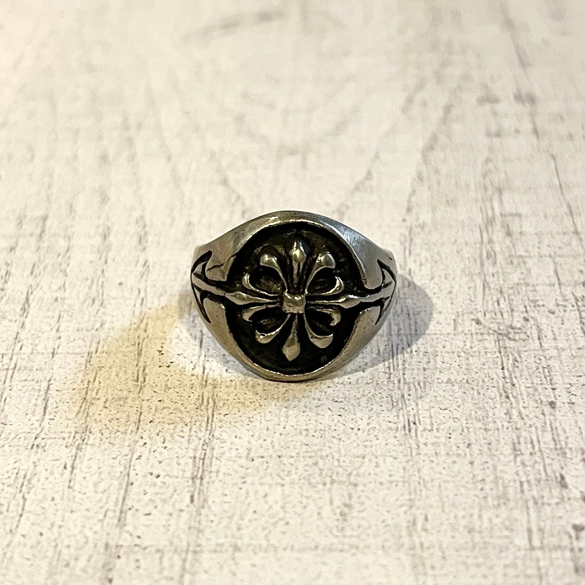 重厚感のあるシグネットに、ゴシック調のクロスモチーフを大胆に配したデザインです。程よい褪色感と、深みのあるシルバーの質感が雰囲気抜群の逸品です。