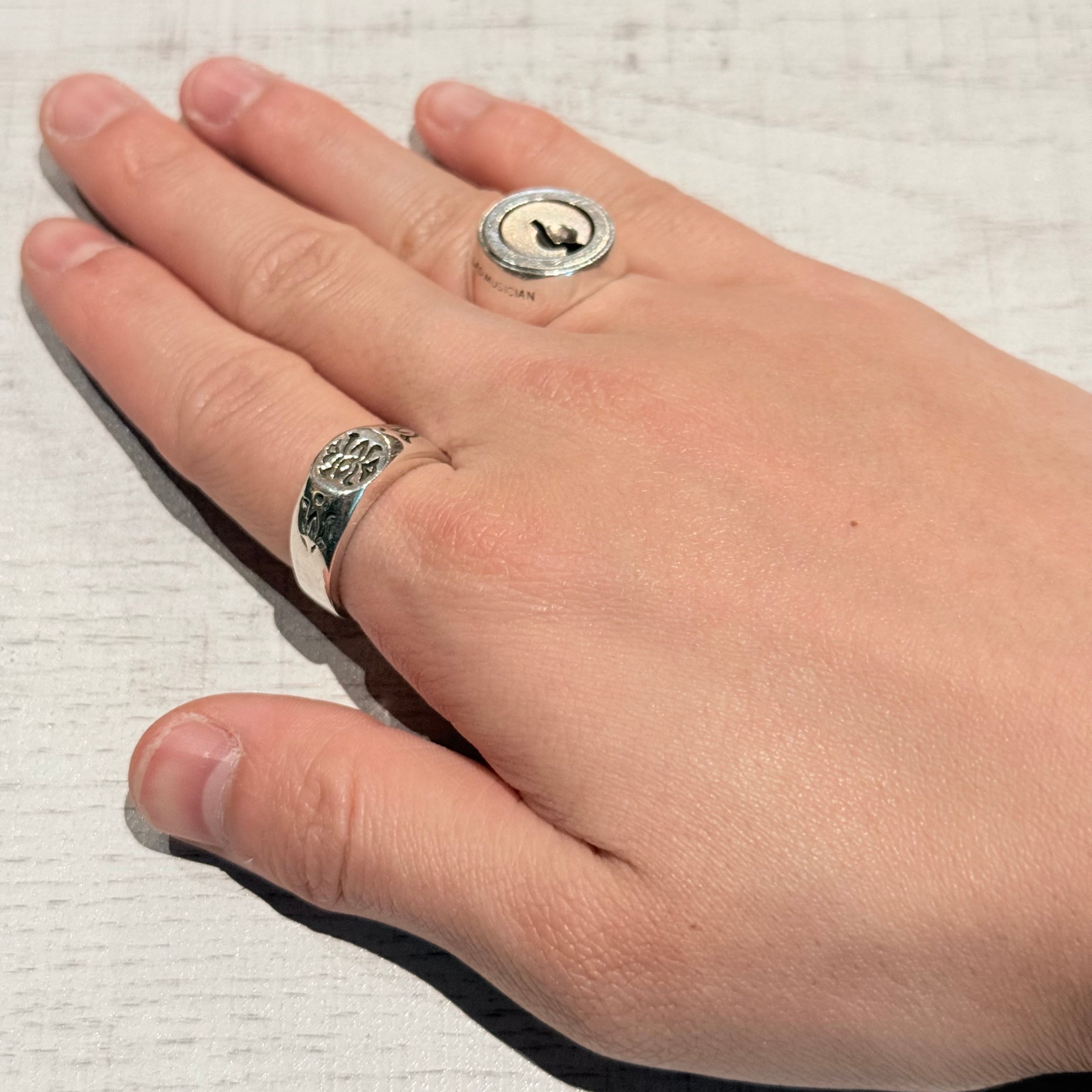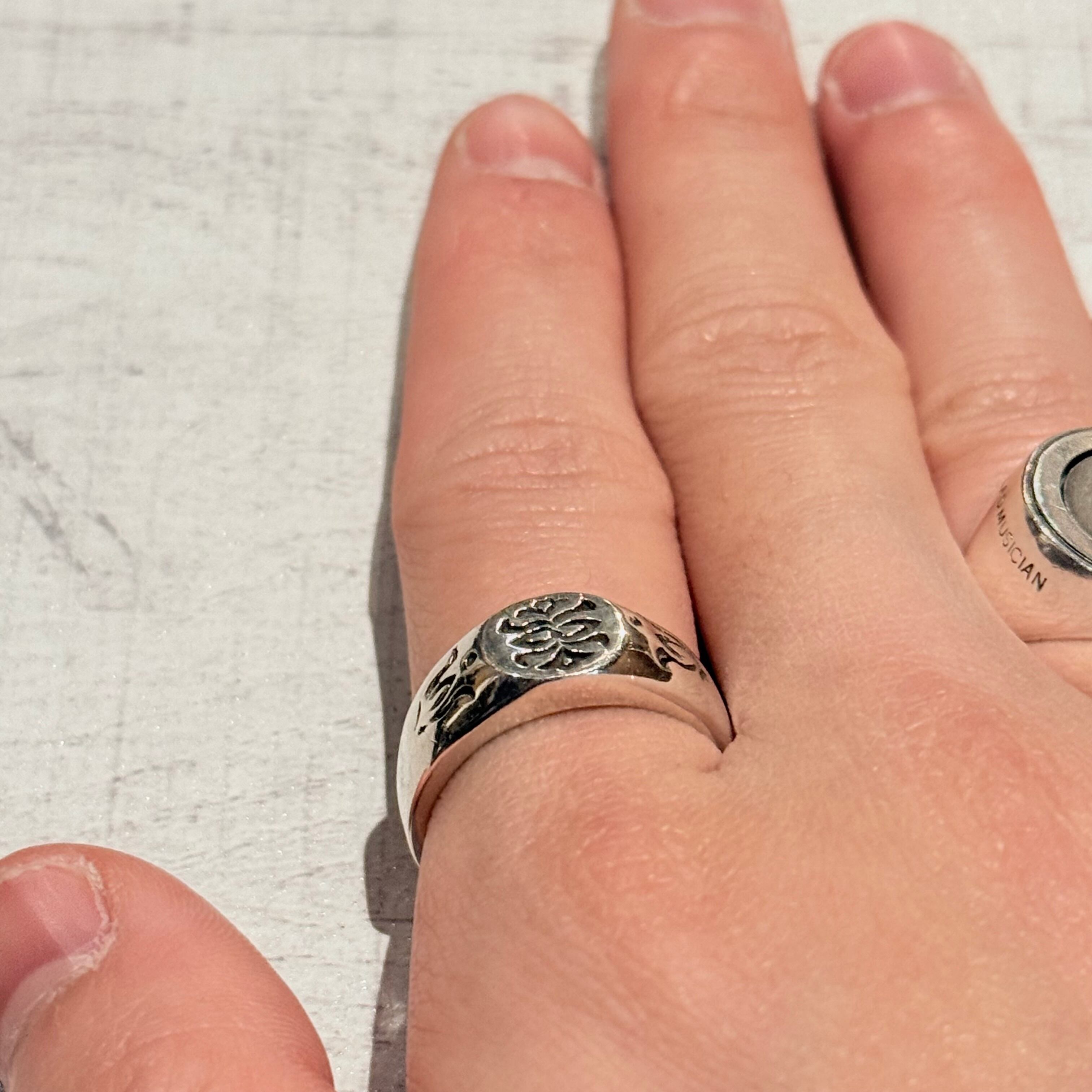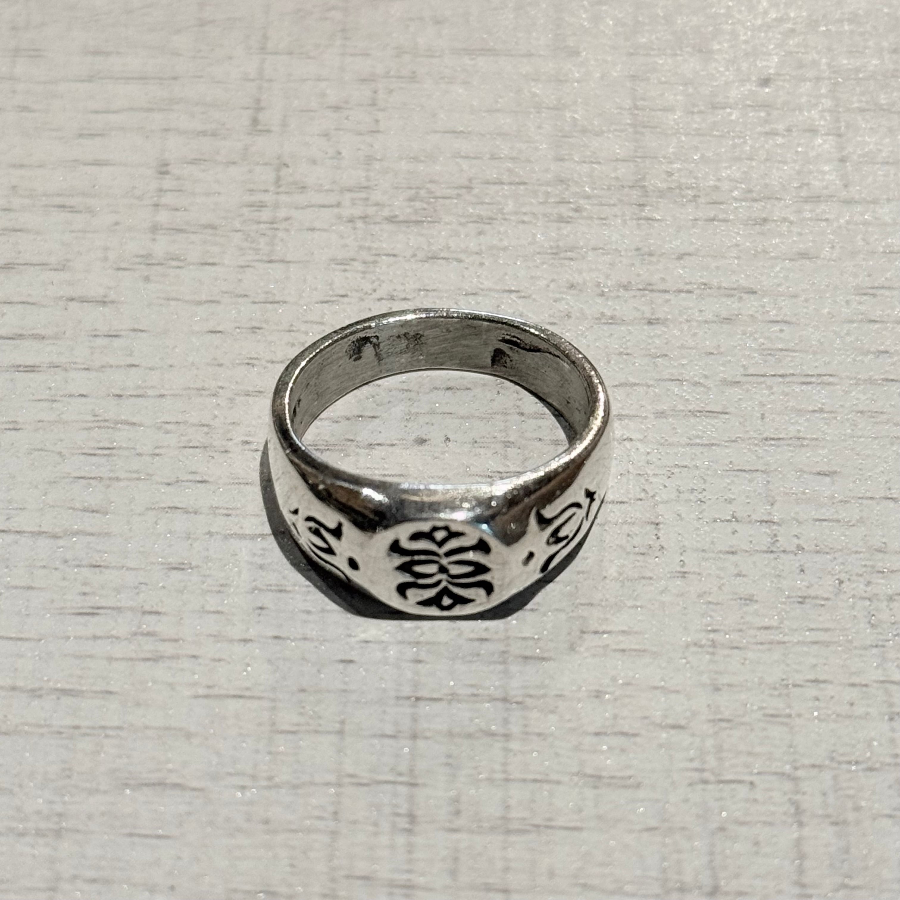 伝統的なネイティブモチーフを現代的にアレンジしたデザインリングです。繊細に刻まれた彫刻模様と立体感のあるフォルムが、手元にアクセントを添えます。
