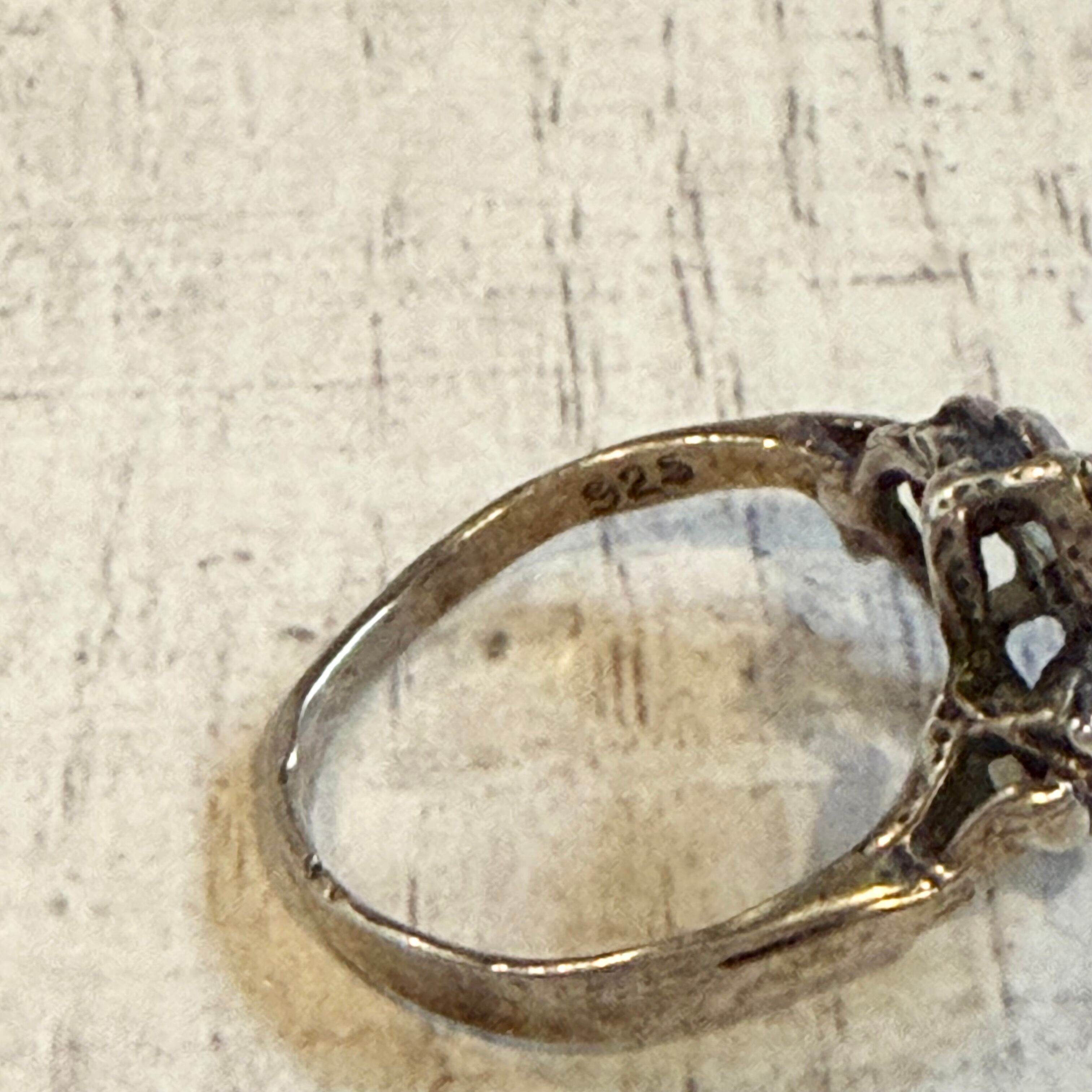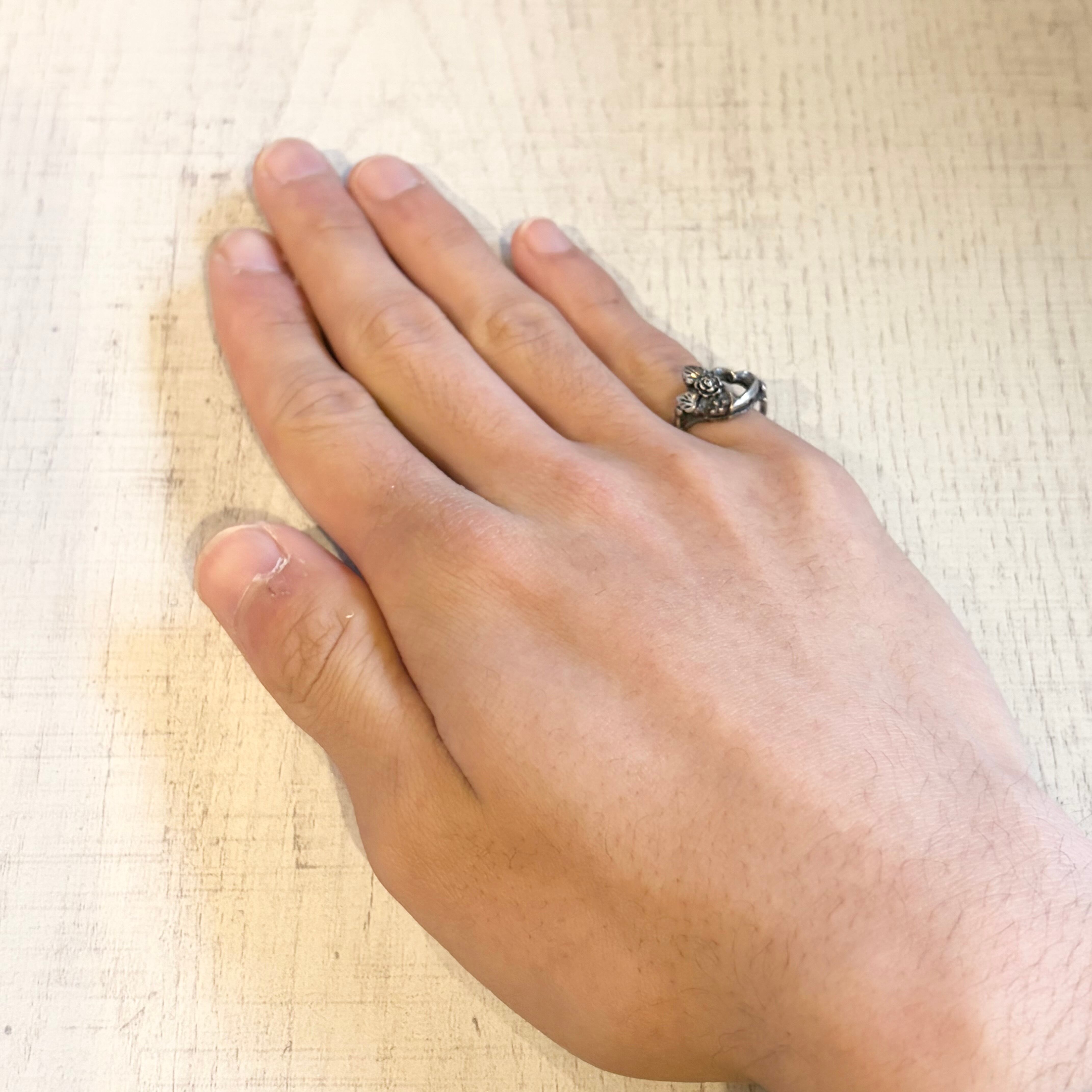 薔薇とハートをあしらった、クラシックなシルバーリング。アンティーク調の仕上げがヴィンテージ感を演出し、どんなコーディネートにも馴染みます。