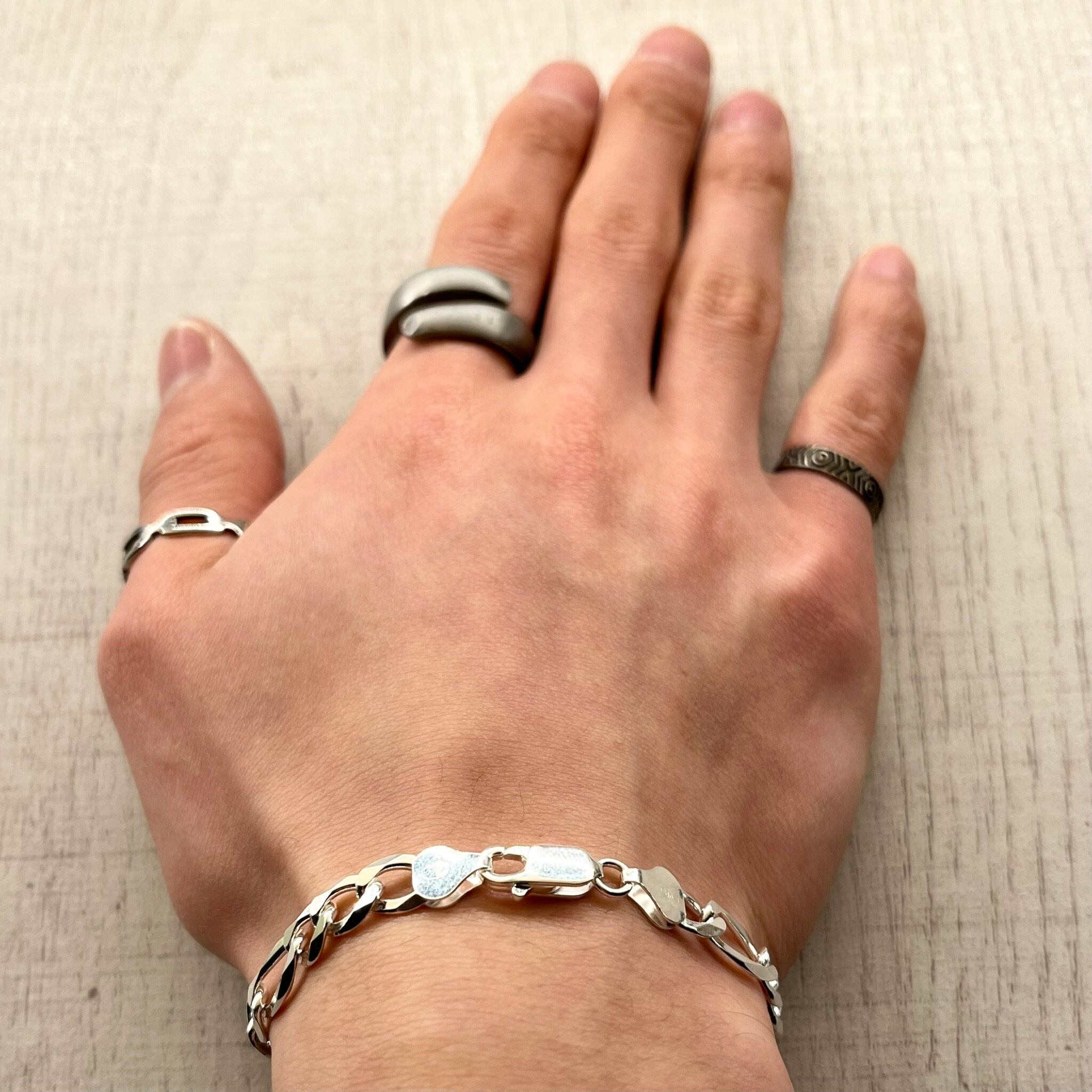 大小のリンクが交互に組み合わさった、イタリアンスタイルの定番、フィガロチェーンのブレスレットです。表面にはフラットなカットが施されており、光を反射してキラリと強い輝きを放つのが特徴です。歴史あるデザインだからこそ飽きが来ず、幅広いスタイルに溶け込む逸品です。