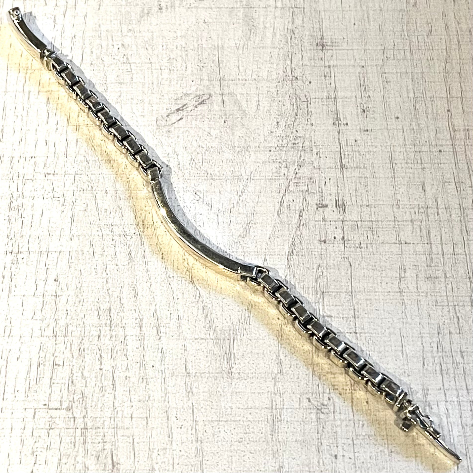 スクエア型のコマを繋ぎ合わせたボックスチェーンに、プレート状のパーツが組み合わさったデザインです。シルバーの滑らかな質感と、深みのある重厚感が際立った逸品です。