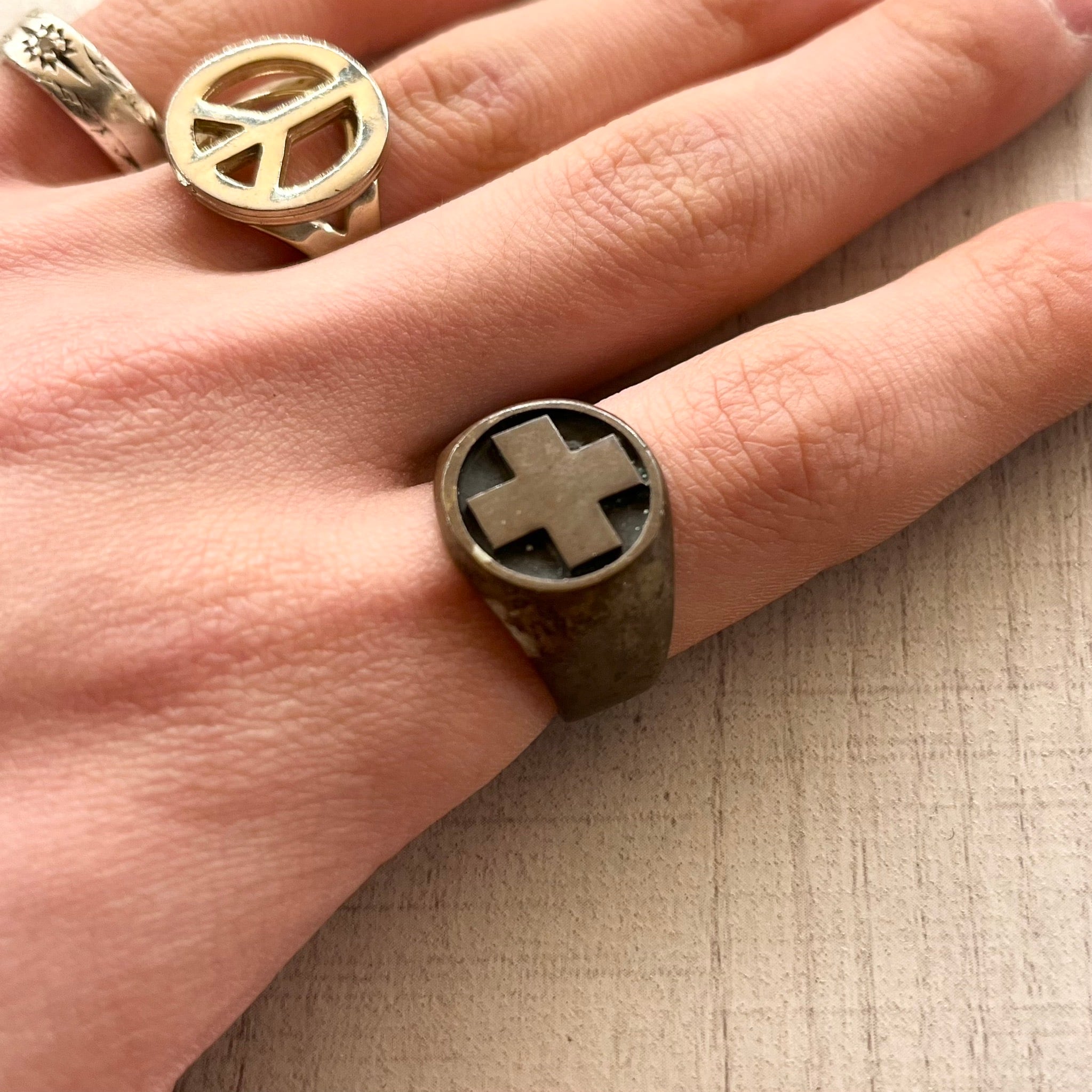 重厚感のあるシグネットスタイルのリングに、ゴシックなクロスモチーフをあしらったデザインです。程よい褪色感があり、雰囲気抜群の逸品です。