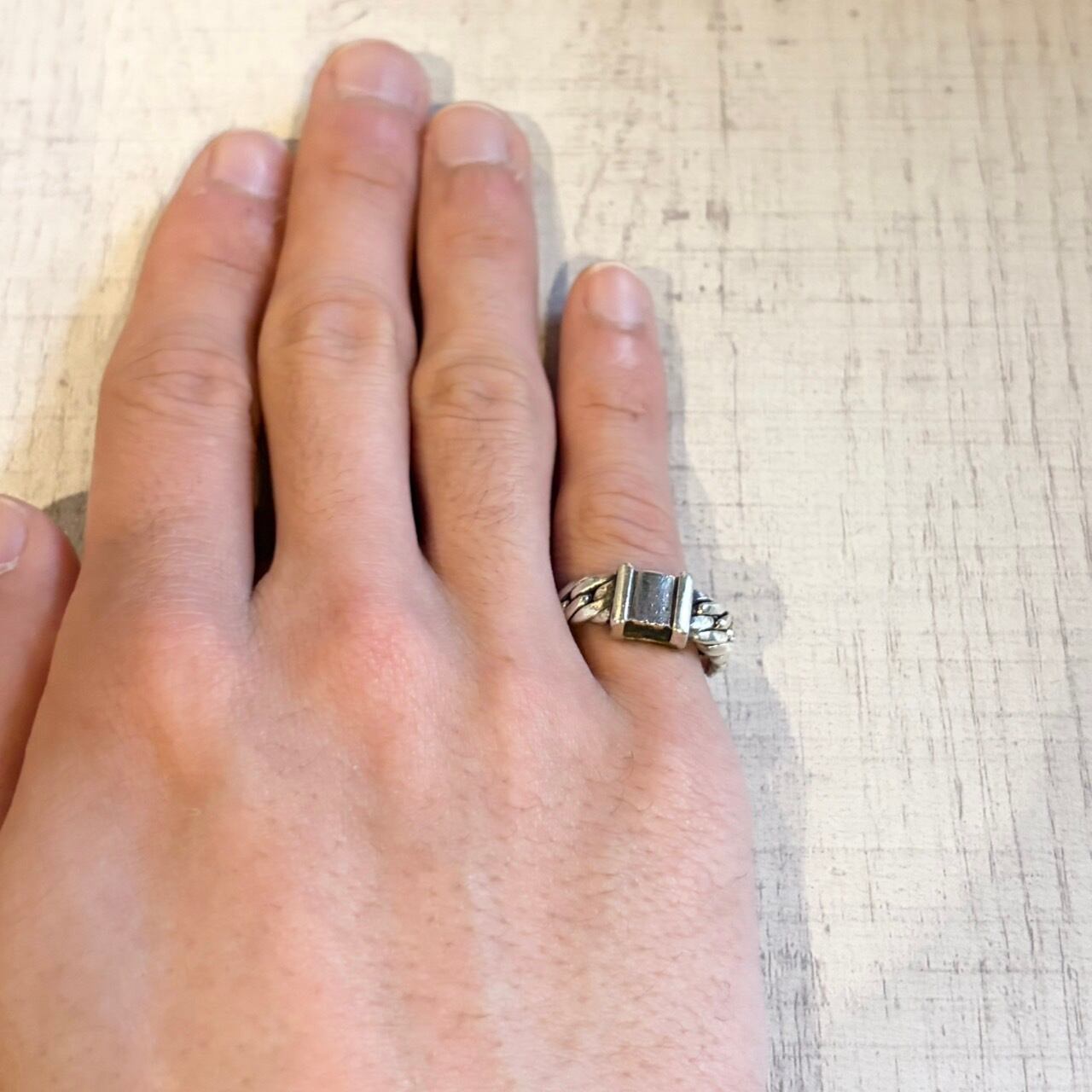 海外買い付けのシルバーリング。中世の鎖帷子(くさりかたびら)のような堅牢さを感じさせ、中央のソリッドなバックルプレートが全体を冷徹に引き締めます。