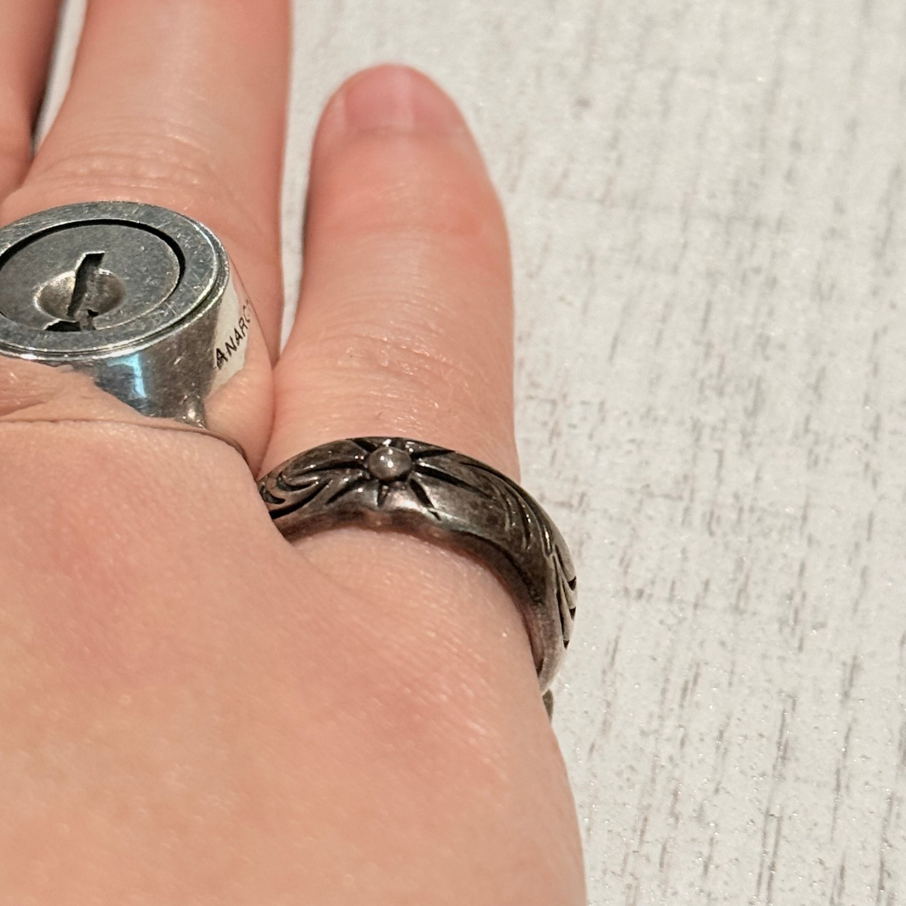 伝統的なネイティブモチーフを現代的にアレンジしたデザインリングです。繊細に刻まれた彫刻模様と立体感のあるフォルムが、手元にアクセントを添えます。