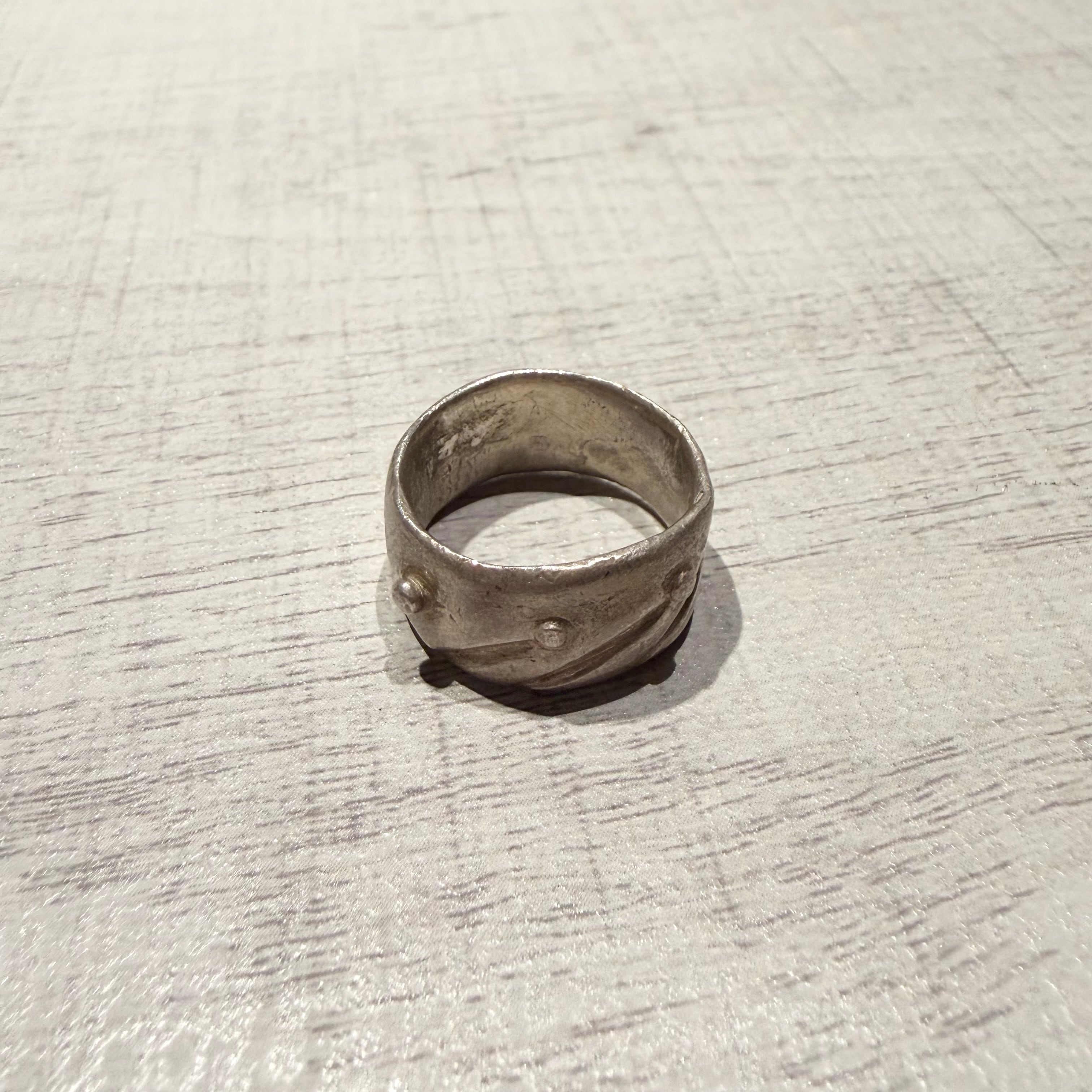 唯一無二の、素朴な魂。このヴィンテージ加工されたシルバーリングは、砂漠の伝統の真髄を捉えている。
