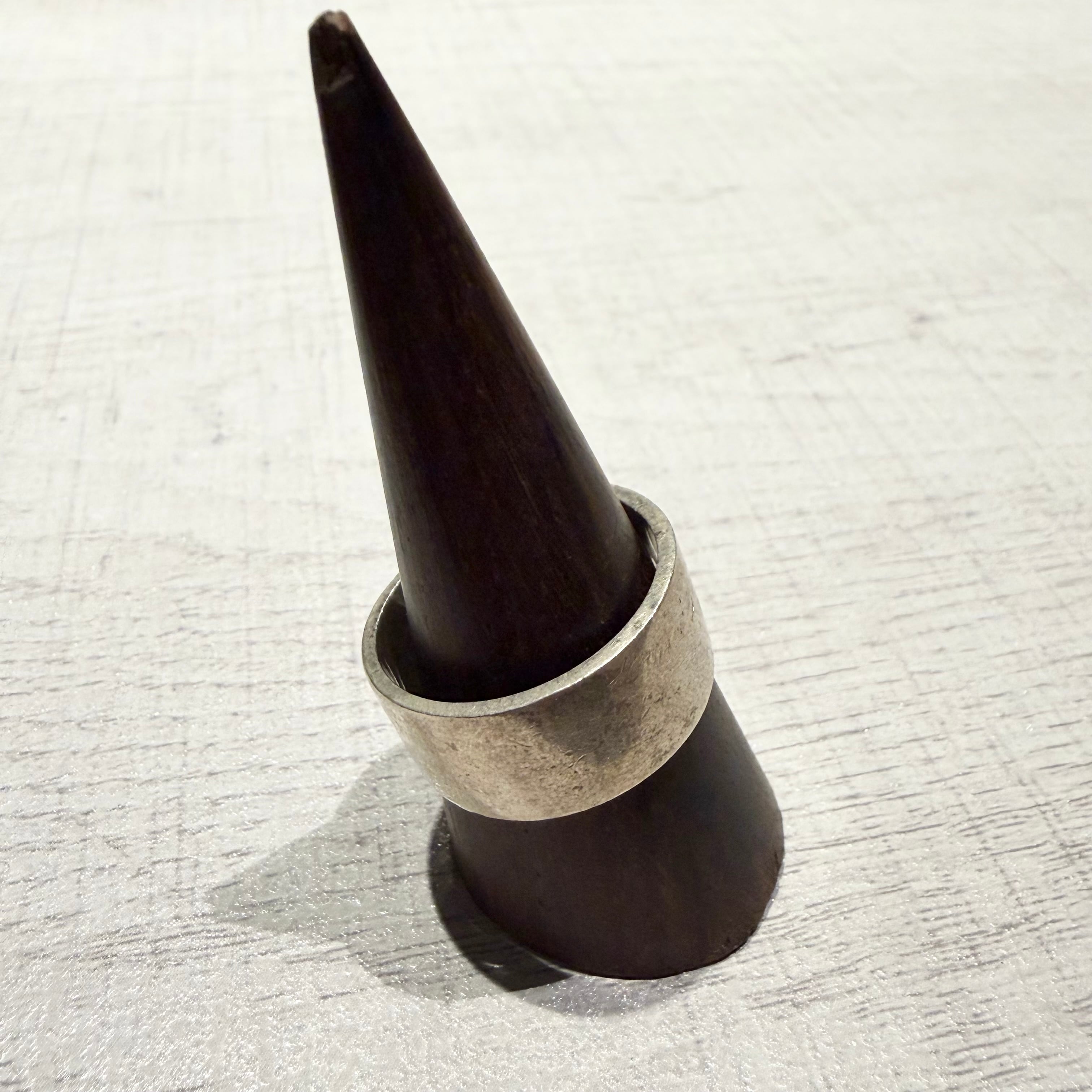 歳月を経たような仕上げを施したこのリングは、時代を超えた工芸品のような個性を備えています。意図的な不完全さとマットなシルバーの質感は、無骨で力強い魂を宿し、まるで物語を語りかけるかのような佇まいを見せます。