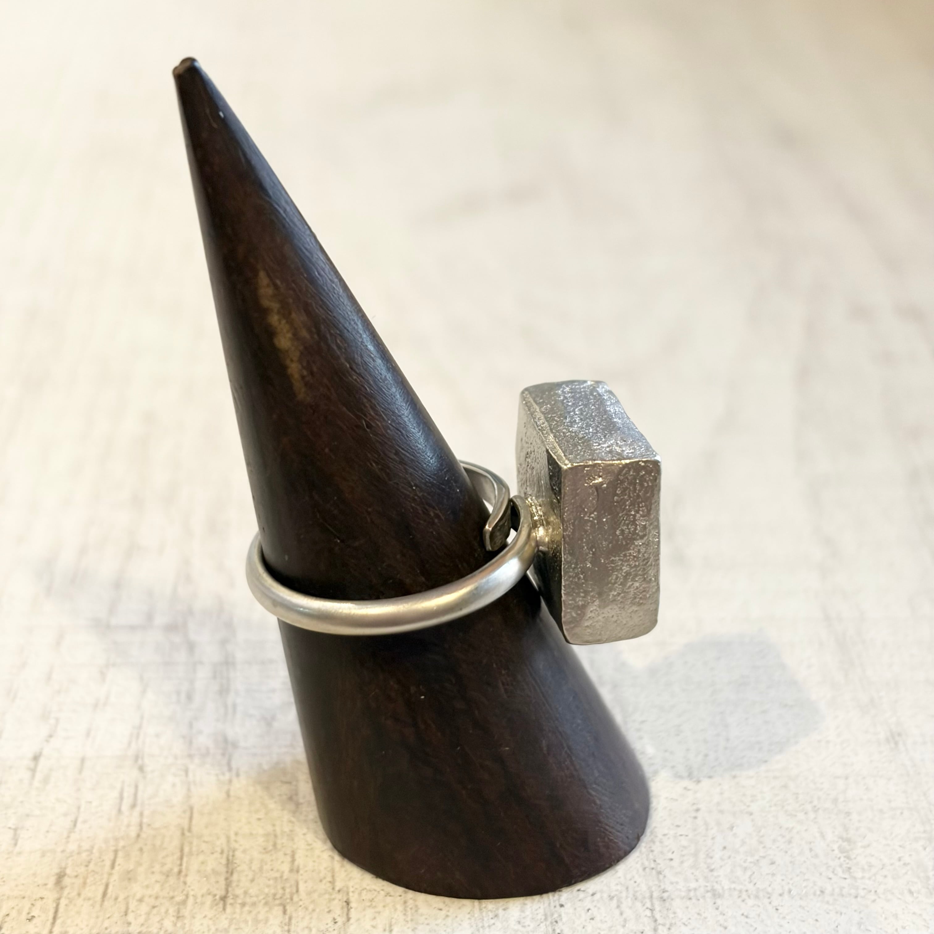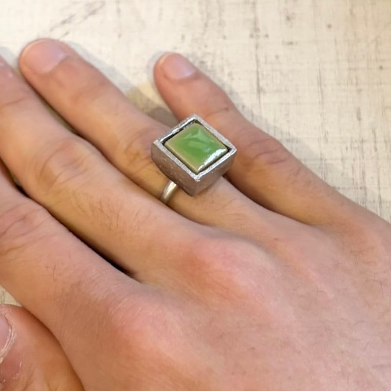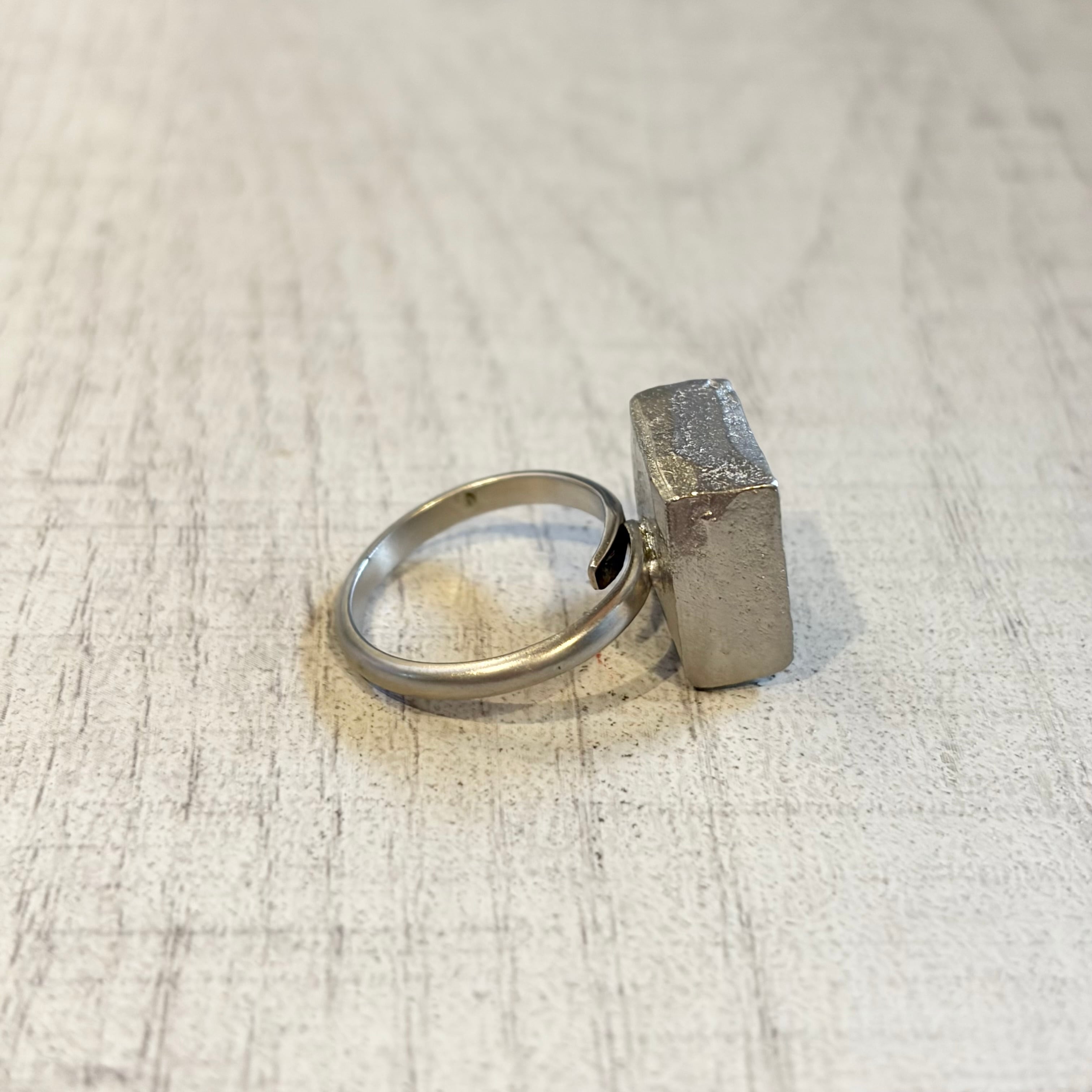 海外買い付けのシルバーリング。鋭い角と有機的な色彩の融合。マットなシルバーにセットされた大胆なスクエアストーンが、現代的な洗練を定義します。
