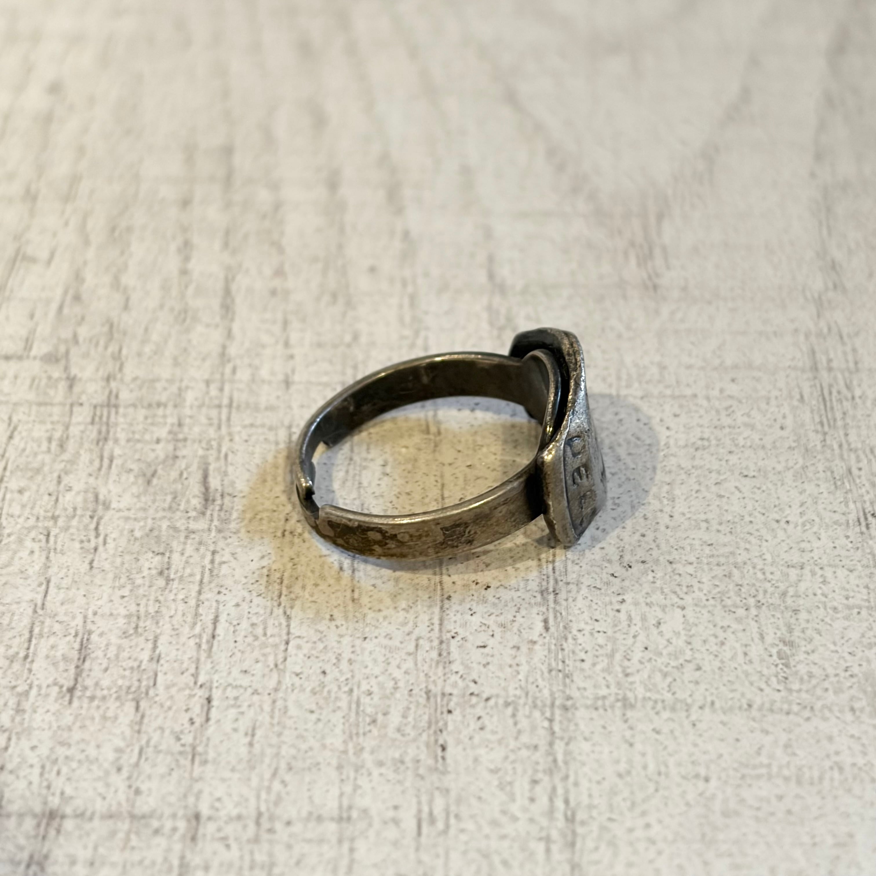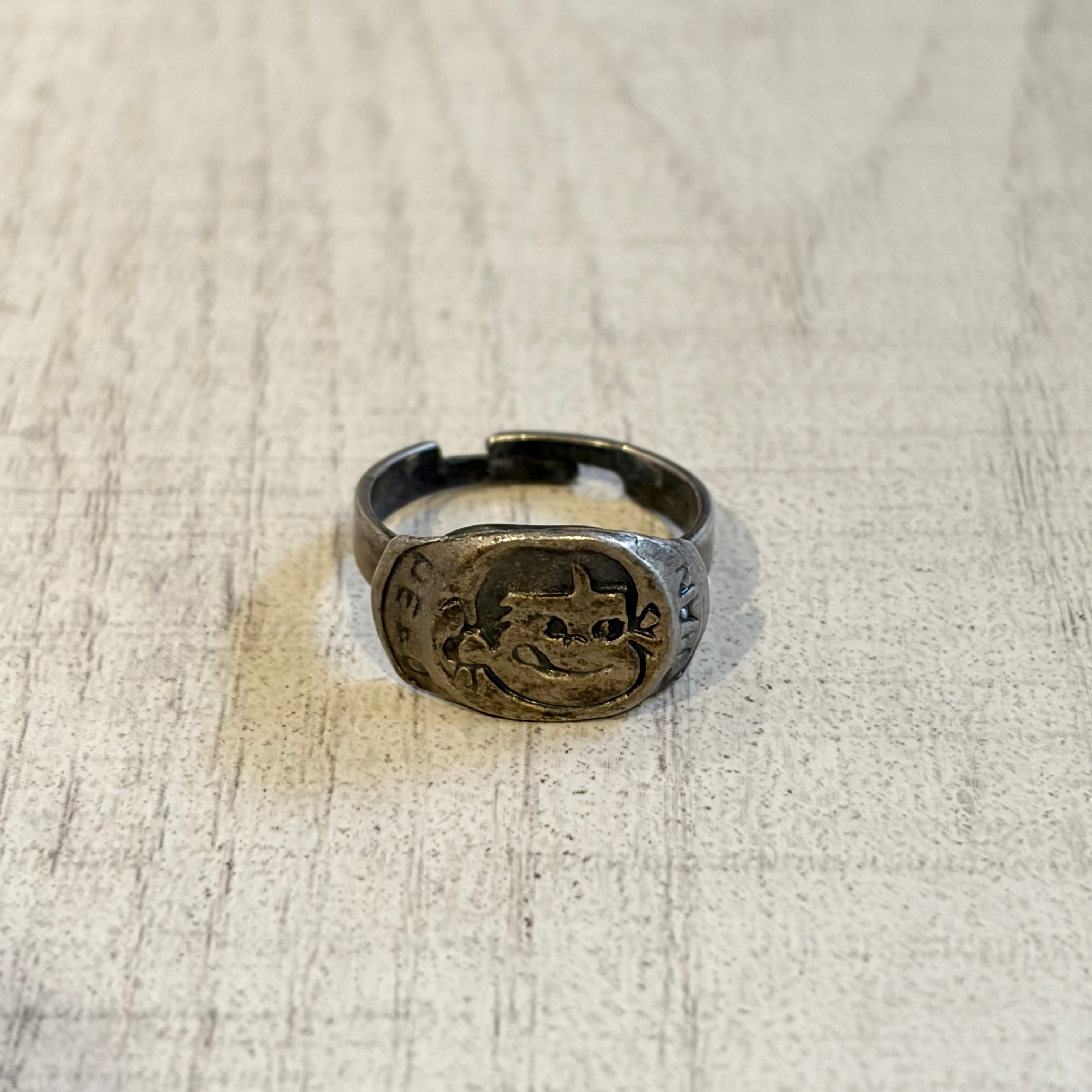 日本の菓子文化の黄金時代から発掘されたヴィンテージの遺物。この酸化した真鍮のリングには、陽光を浴びたような中央プレートにペコちゃんの象徴的な笑顔が浮き彫りにされています。