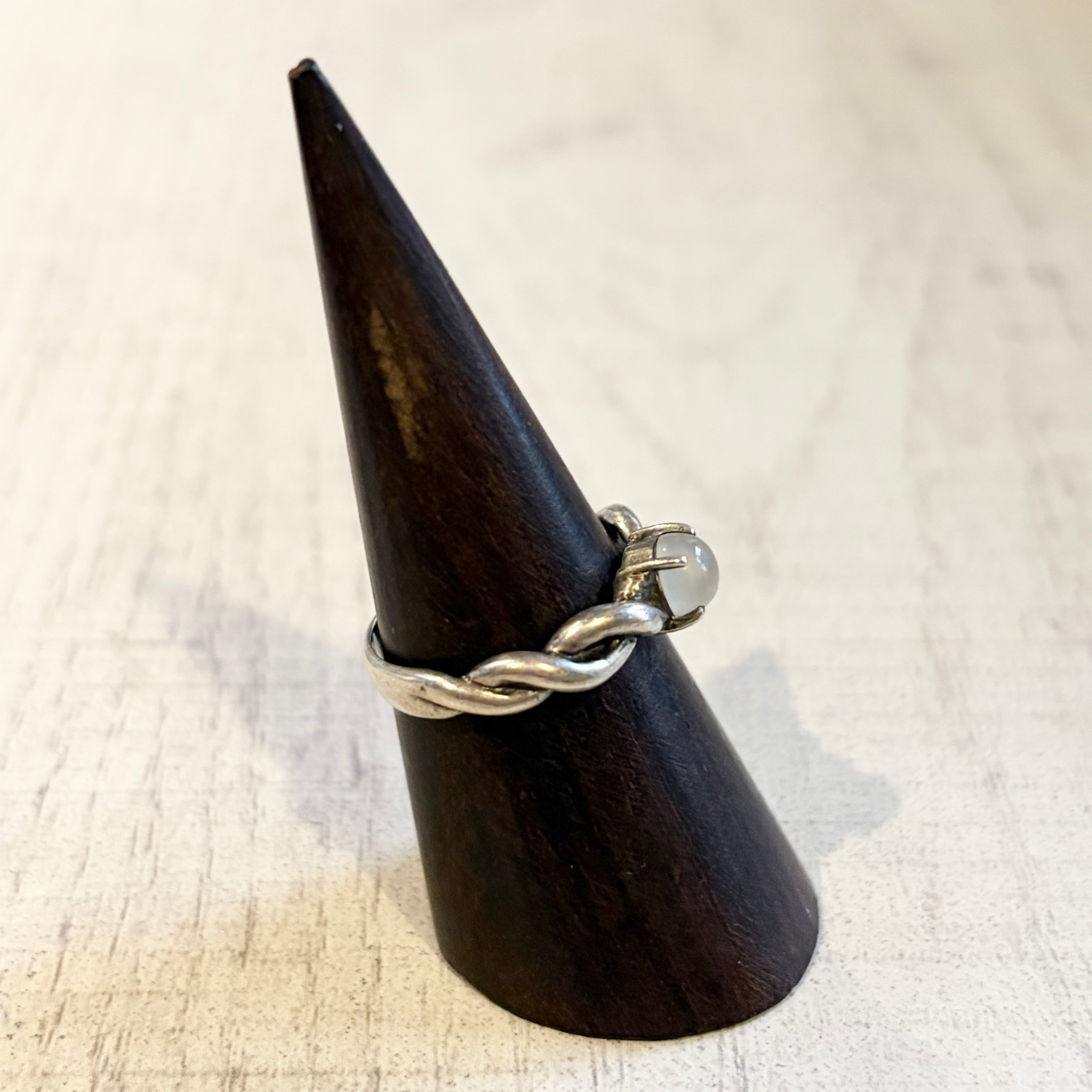 海外買い付けのシルバーリング。二端のない銀の螺旋が、天界の雫(ムーンストーン)を抱きかかえる。月の引力によって編み上げられたようなそのフォルムは、「不変の意志」と「静かなる情熱」の調和を象徴している。