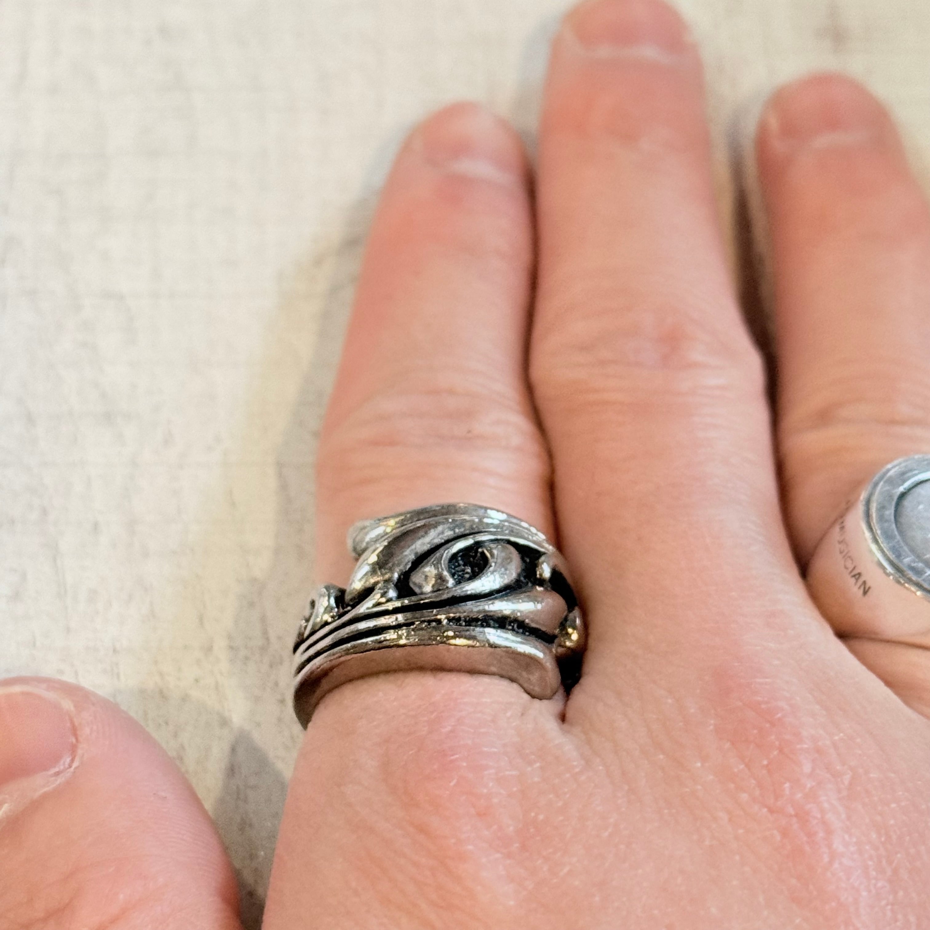 液体が波打ち、そのまま形を成したような有機的なシルエットが特徴のリングです。