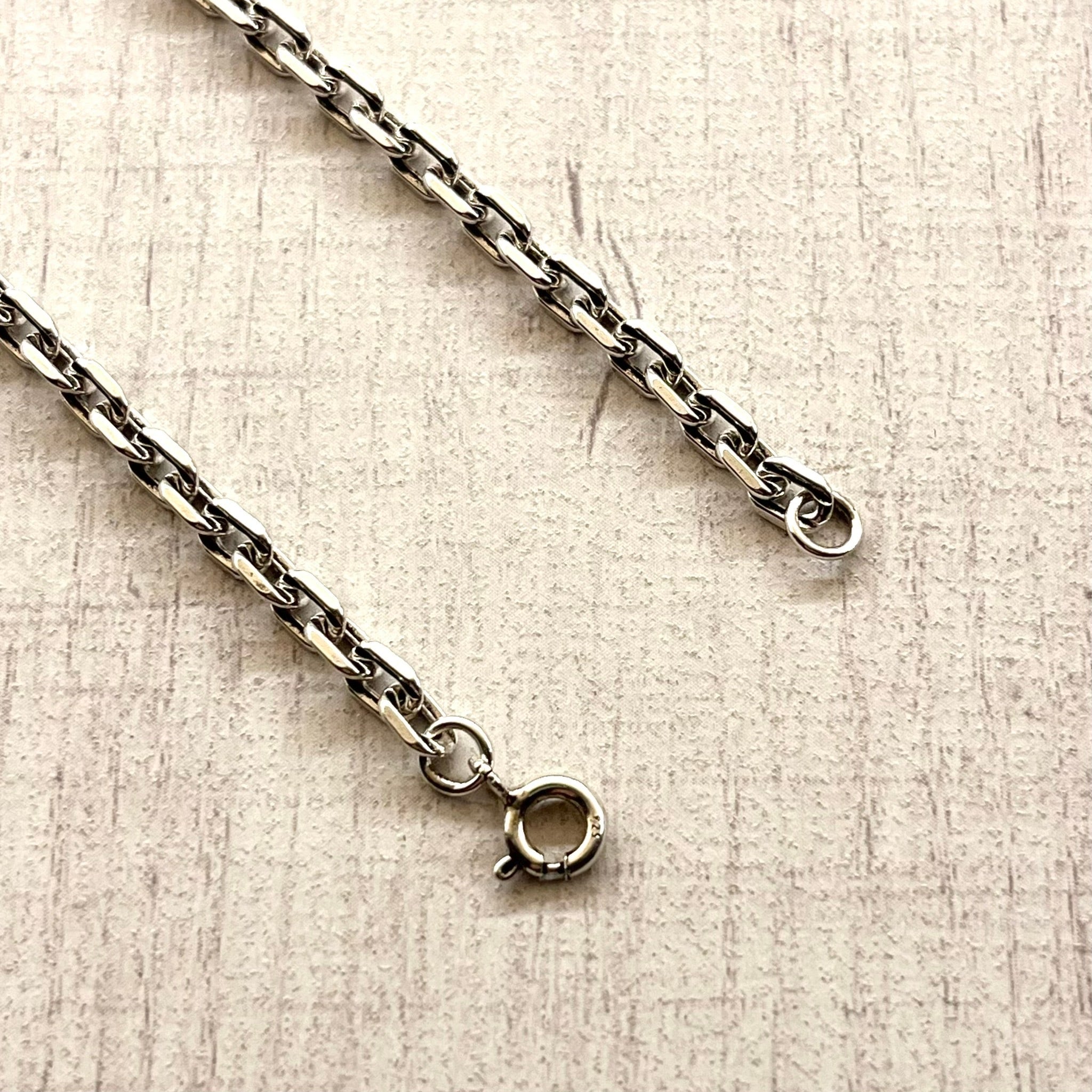 角ばったフォルムが特徴の、クラシックなオーバルチェーンブレスレットです。プレーンなデザインですが、シルバーの上品な輝きがさりげなく存在感を放つ逸品です。