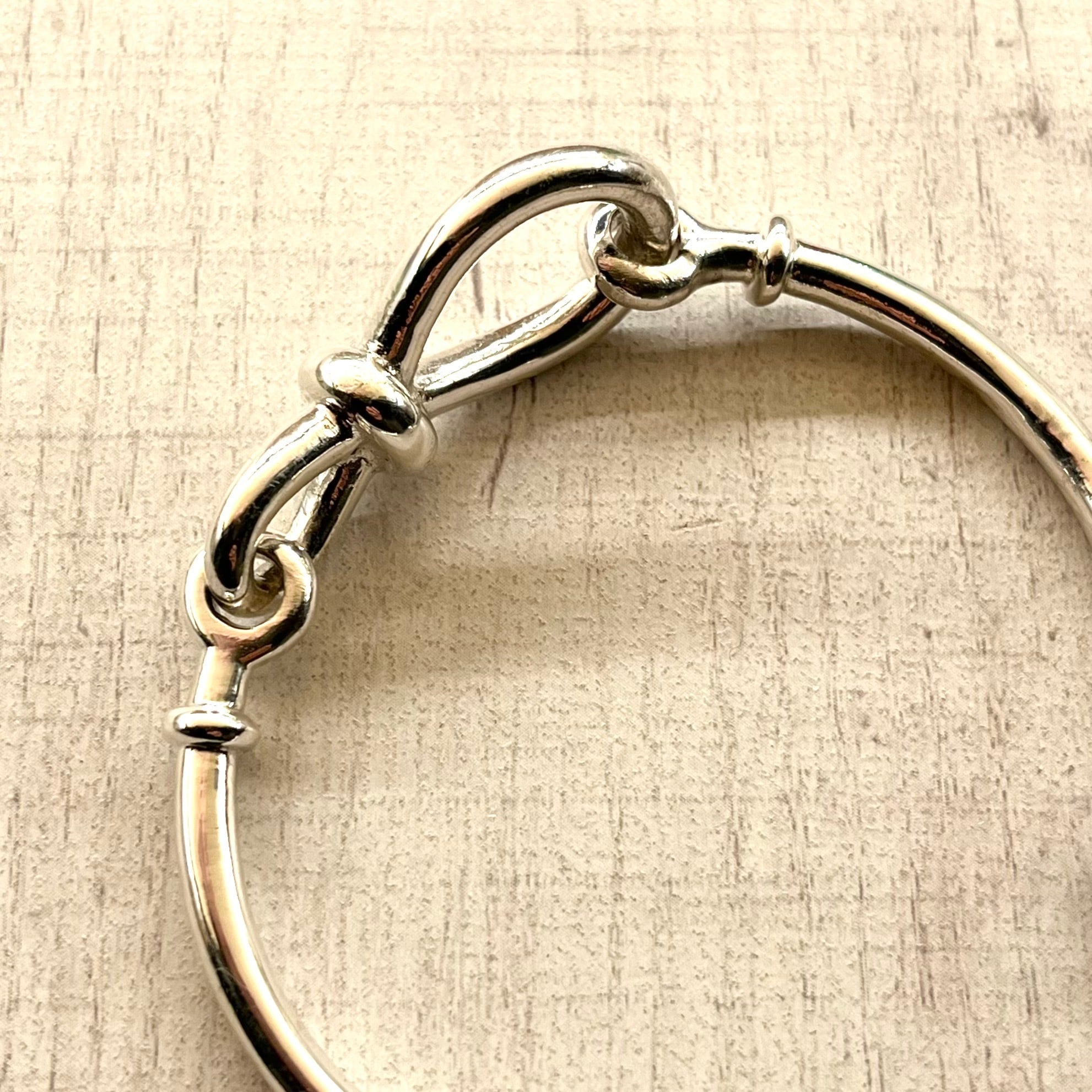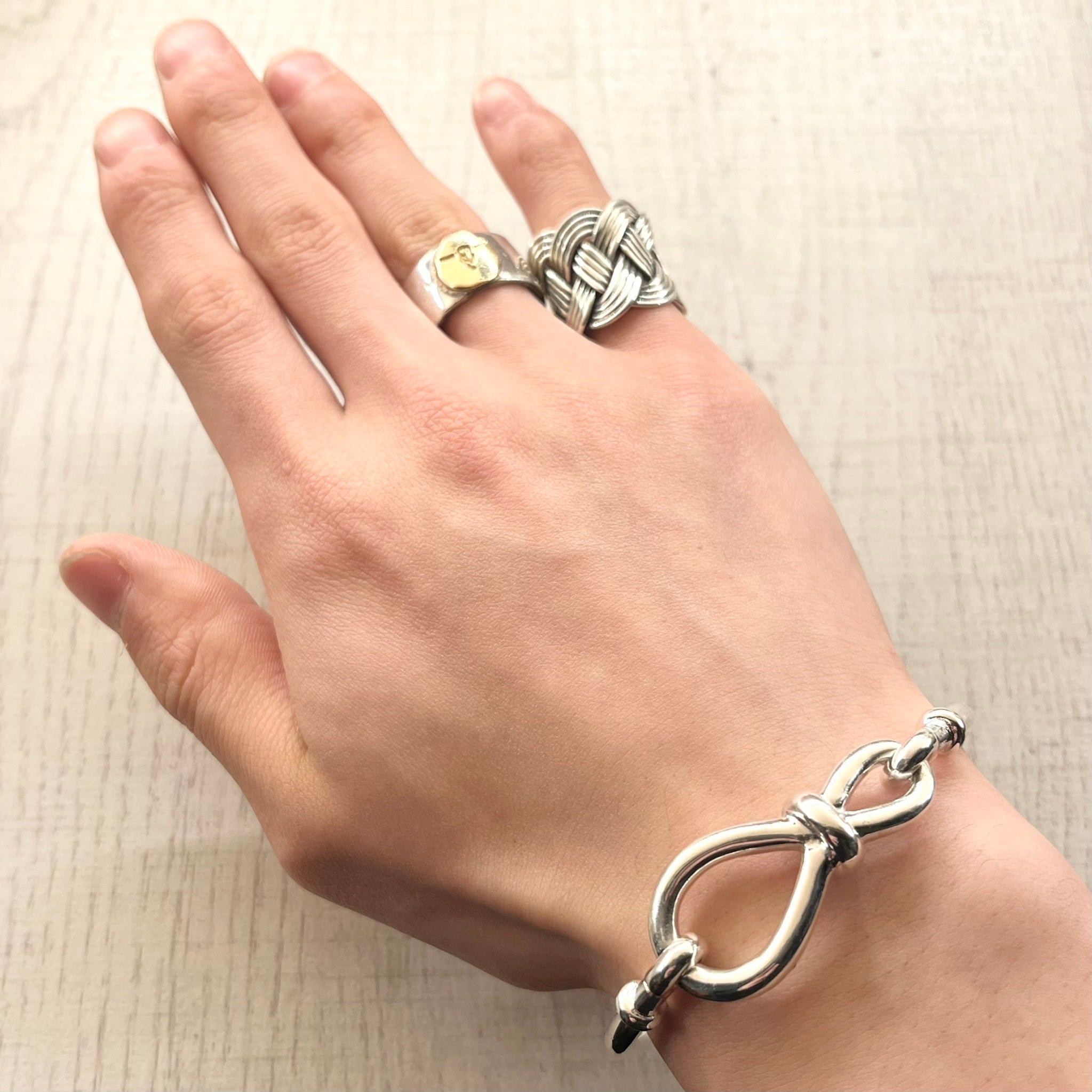 中央に配された結び目のモチーフが特徴的なブレスレットです。派手すぎないデザインながら、シルバー特有の滑らかな質感と深みのある重厚感が確かな輝きを放つ、主役級の逸品です。