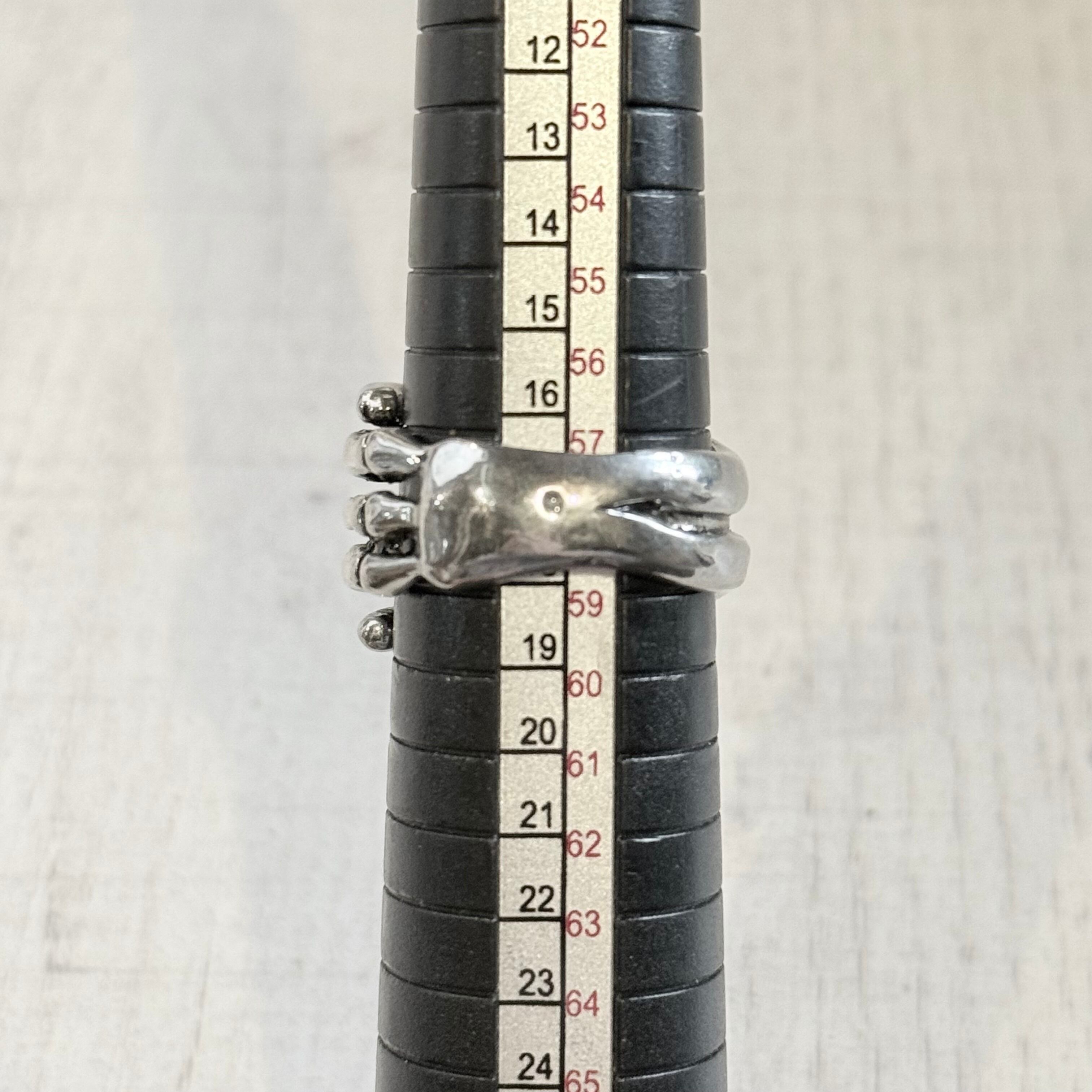 骸骨の手が指に直接巻き付いているかのようなユニークなデザインリングです。
