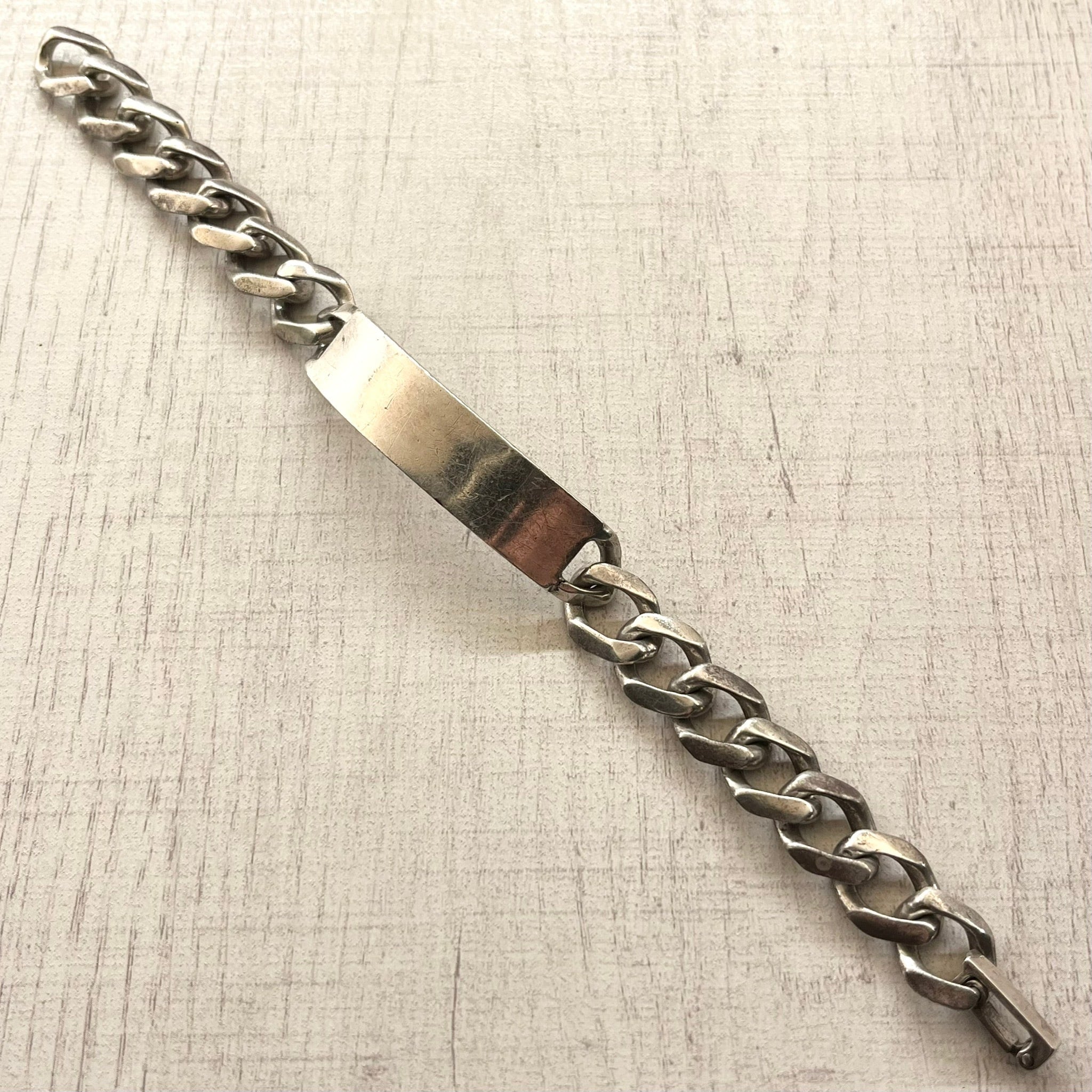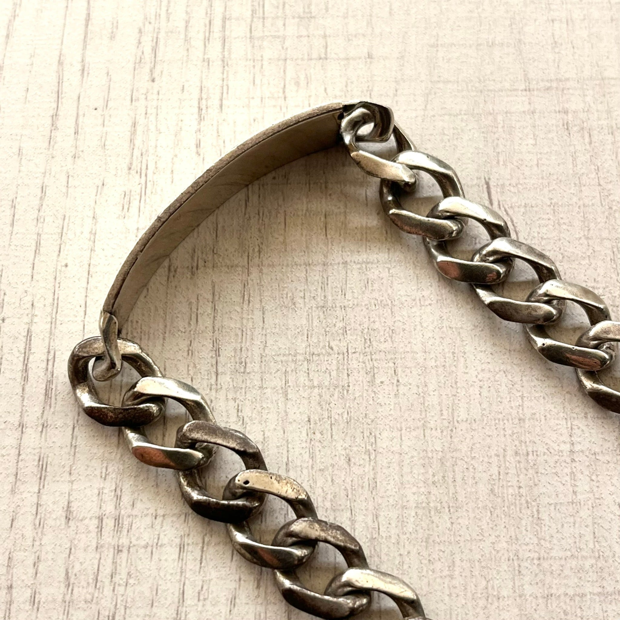 クラシックな喜平チェーンのIDブレスレットです。シルバー特有の重厚感と、深みのある褪色感があり、圧倒的な雰囲気と存在感を放つ主役級の逸品です。