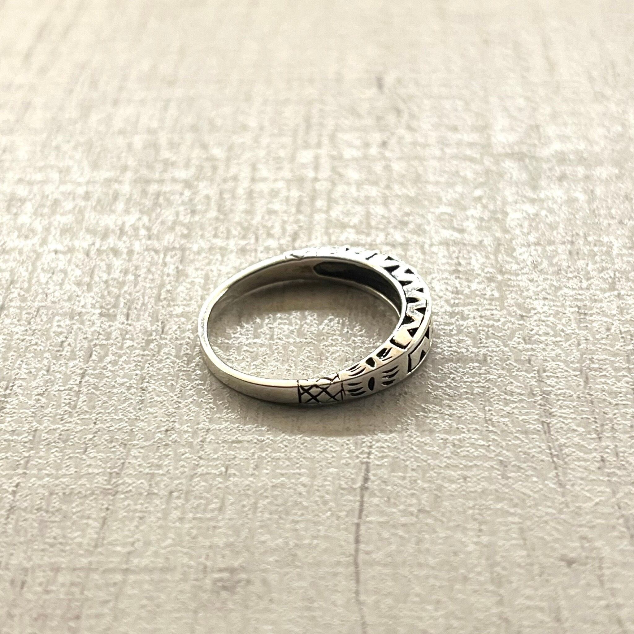 中央にウェーブのラインを彫り込み、その周りに細かな刻印を施した、トライバルな雰囲気を感じさせるリングで