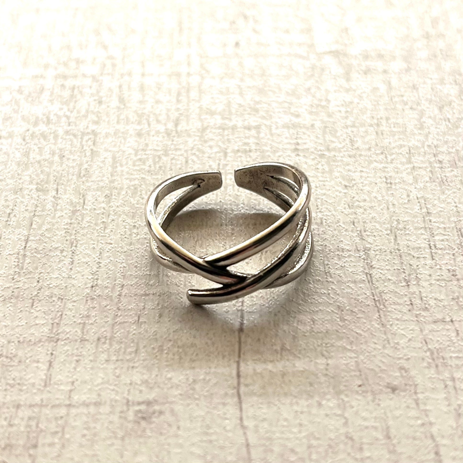 細身のシルバーラインが、まるで指に巻き付くように重なり合ったデザインのリングです。3本のラインが不規則にクロスすることで、見る角度によって表情が変化する立体的なシルエットが魅力の逸品です。