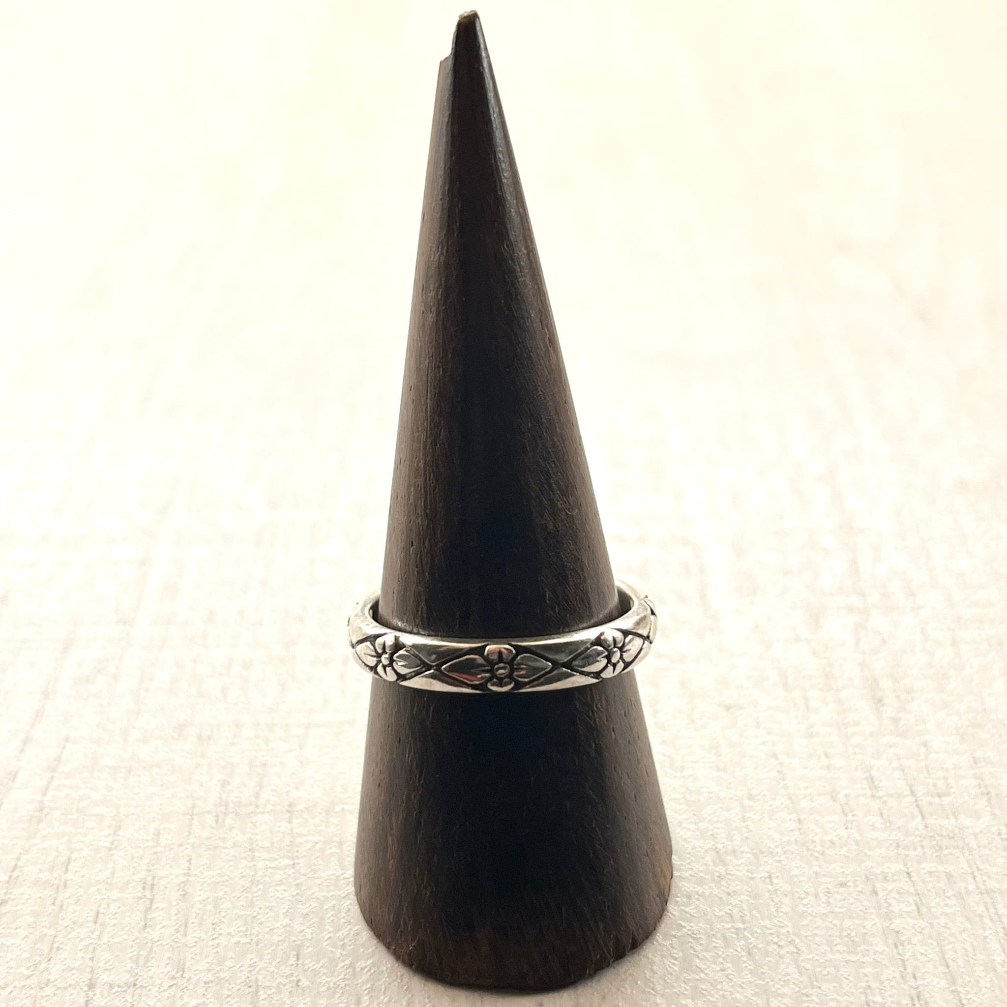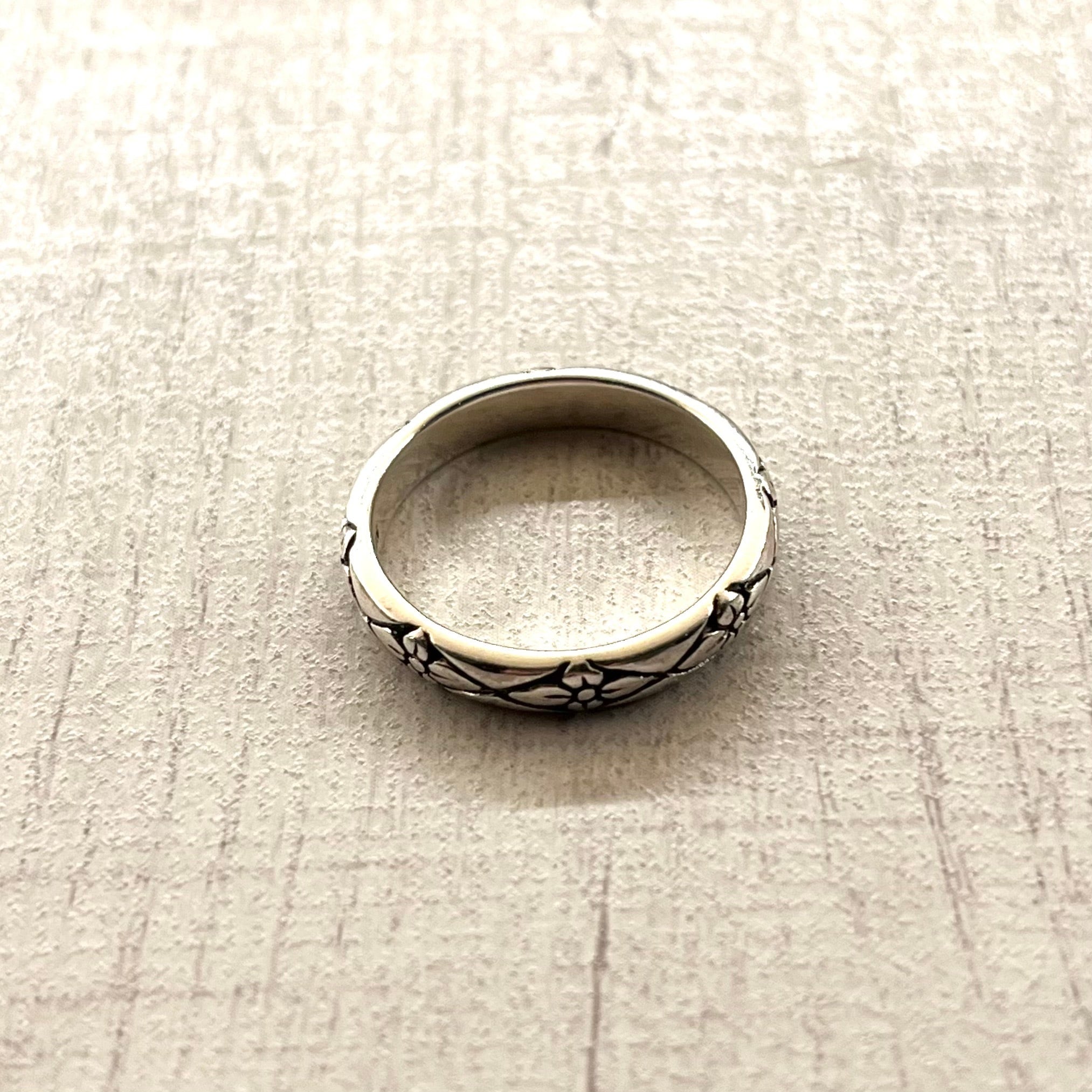 花の模様がリング全体に彫り込まれた、クラフト感あふれるリングです。陰影のある褪色感が雰囲気抜群の逸品です。