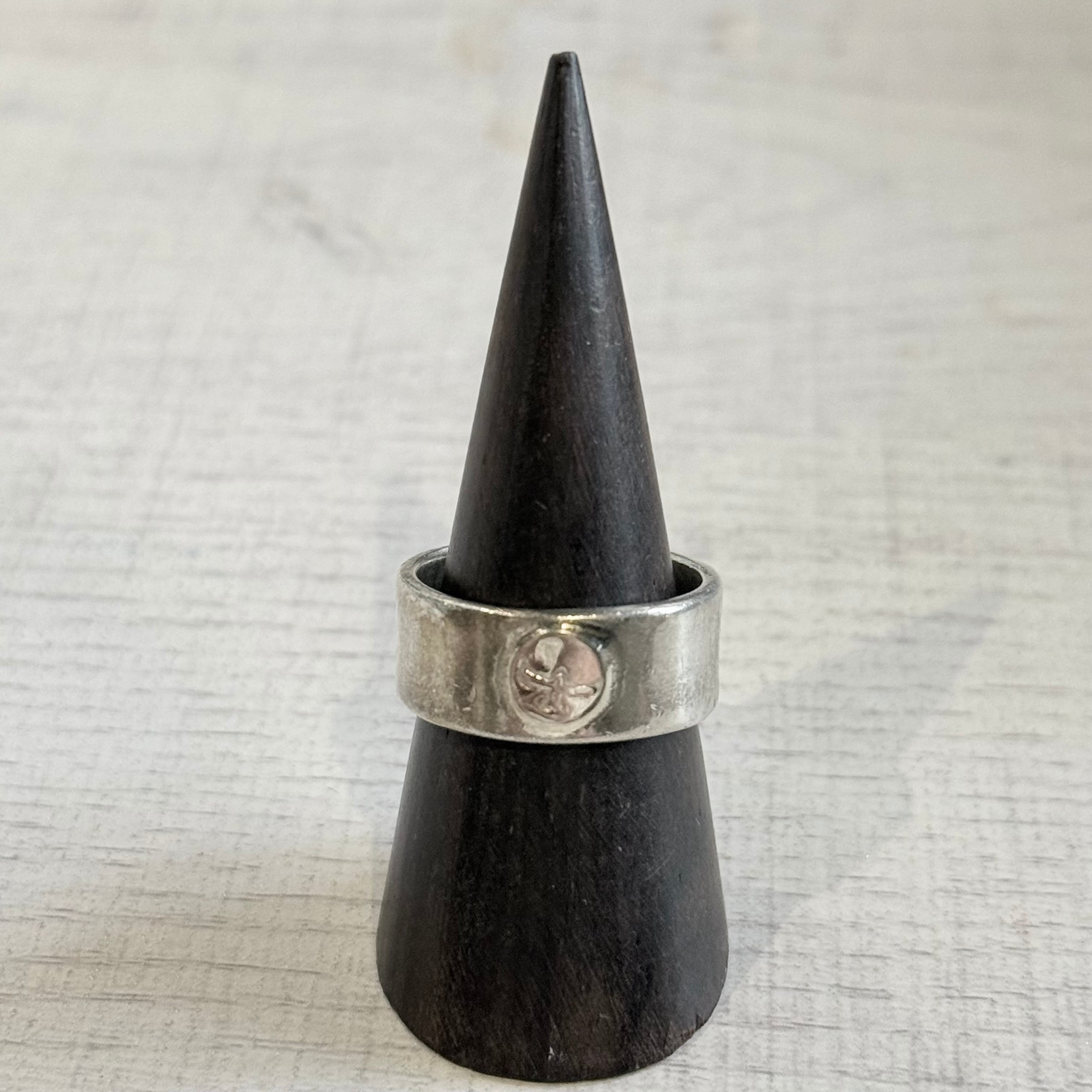 リング中央には、円形に収められた鳥の刻印を配置があり、手元にさりげない個性をプラスします。